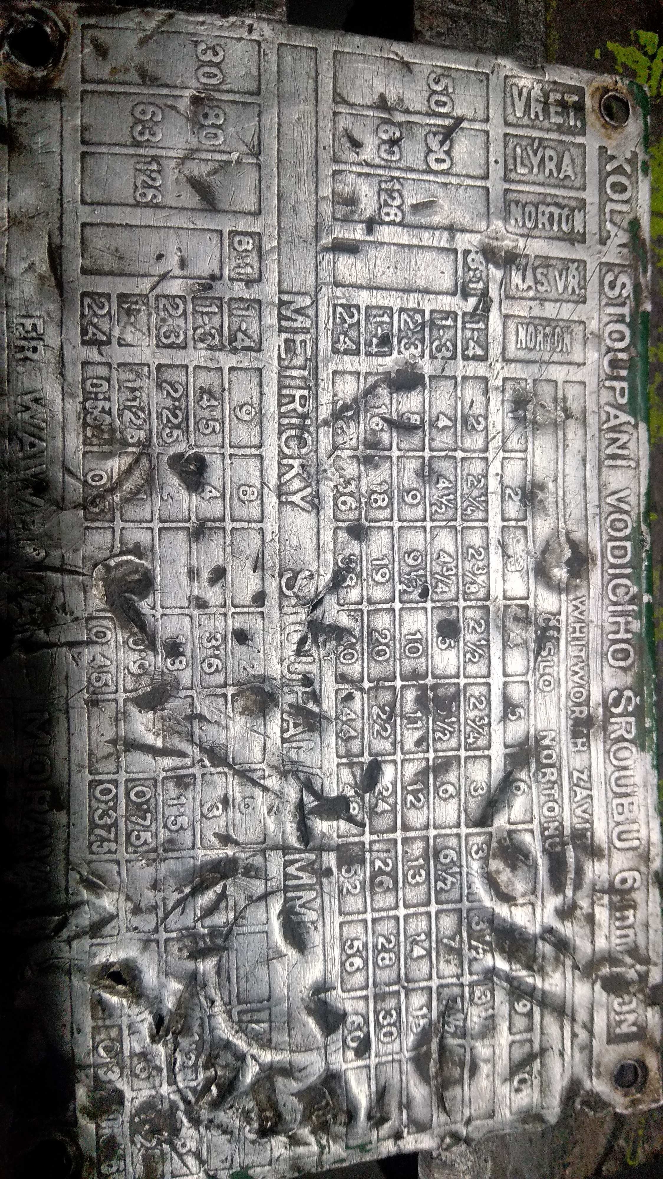 A co se mi pro změnu alespoň částečně dochovalo je tato tabulka, která by se asi mohla hodit i na ten předchozí soustruh (a asi i další této "modelové řady" :) ), ty nortonky vypadají totožně...