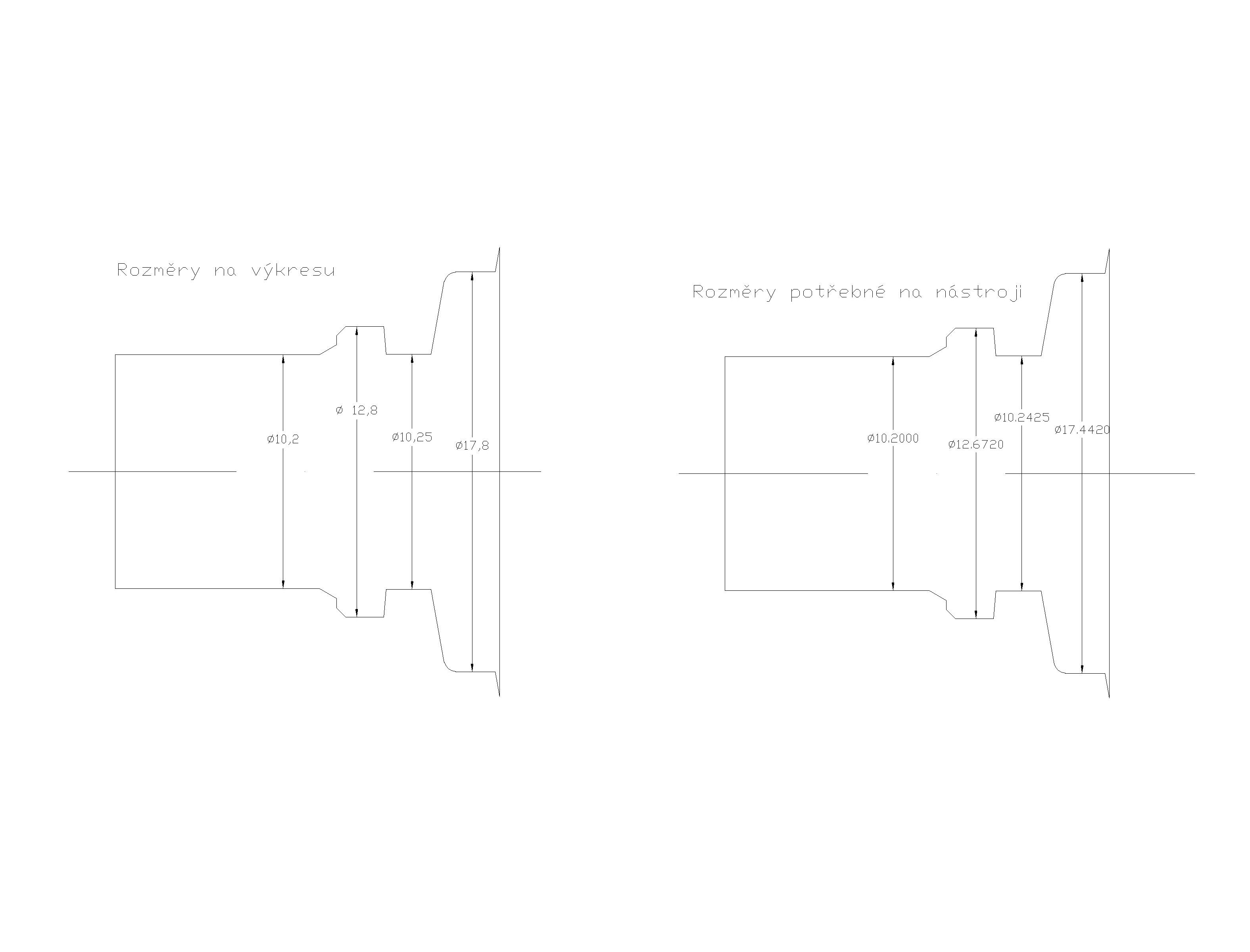 V levo jsou rozměry dané na výkresu a v pravo jsou rozměry upravené na noži aby bylo docíleno na dílu rozměrů z výkresu.