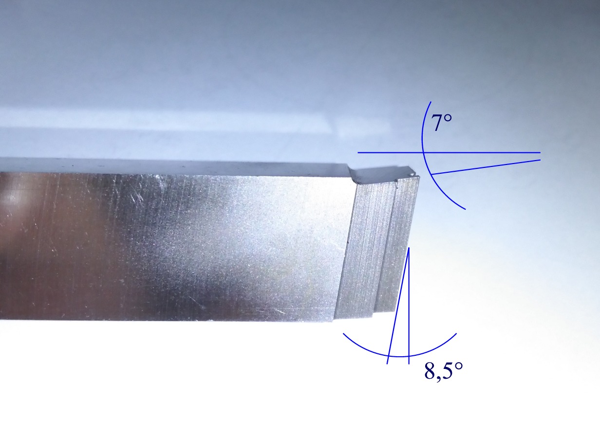 Ta hrana se při řezání pod úhlem 8.5 stupně (beru to podle obrázku, ne podle kóty :-) ) prodlouží 1/cos(8.5) krát, ale pro 3 mm řezané mi vychází délka výsledná 3.033 (a ne 3.3), takže je v tom zjevně něco jiného. Prodloužení na 3.3 odpovídá úhlu hřbetu necelých 25 stupňů (podle mého zběžného výpočtu).