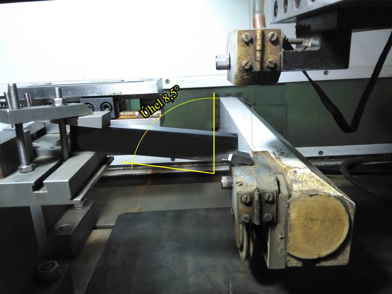 No tak já jsem taky nevychodil matfyz, ale jak tak na to koukám, tak bych řek, že korigovat se to musí podle toho vrchního úhlu 7°. Když si to nakreslíš, tak pokud tam ten nůž zaženeš, špička je v ose, tak břit se na větším průměru posunuje dolů a dochází k řezání většího průměru než je požadováno. Tak pokud je při 0° rozdíl malého a velkého průměru x tak při podproušení to bude řezat rozdíl průměrů a/cos alfa. Což na a= 10 dělá 10,075 . Nicméně tím že jsi to vyřezal pod úhlem 8.5ˇ tak se to kapku komplikuje.