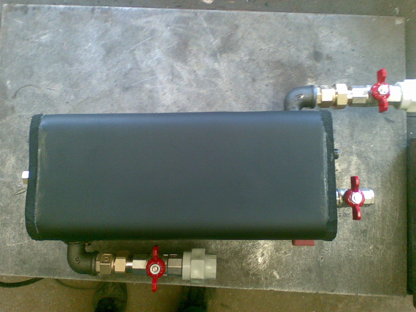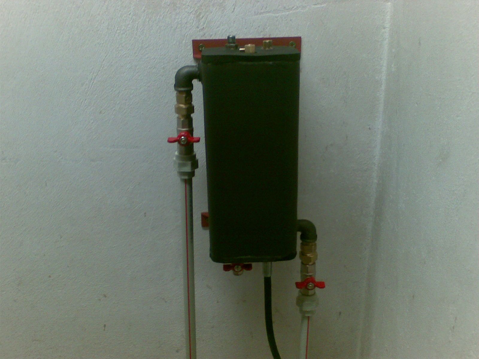 Inovace bez legrace - nač ohřívat olej z 5st. na 120st. elektricky, když ho může z 5st. na 70st. a víc ohřívat kotlová voda. Elektrika ho jen dohřeje ze 70st. na 120st. Jekl v jeklu vnitřní 90x90x3 a vnejší 120x120x3. Dole přívod studeného oleje a odkalovací ventil, nahoře odvod teplého oleje, odvzdušňovák na olej a na vodu. Z boku přívod a odvod topné vody. Připojeno do radiátorového okruhu. Polepeno chlaďařskou kaučukovou izolací 10mm silnou. Objem cca 2,5 litru což musí v pohodě stačit protože jedno čerpání je 0,5 litru a čerpání probíhá v cca 15 minutových intervalech (pokud jede hořák non-stop).