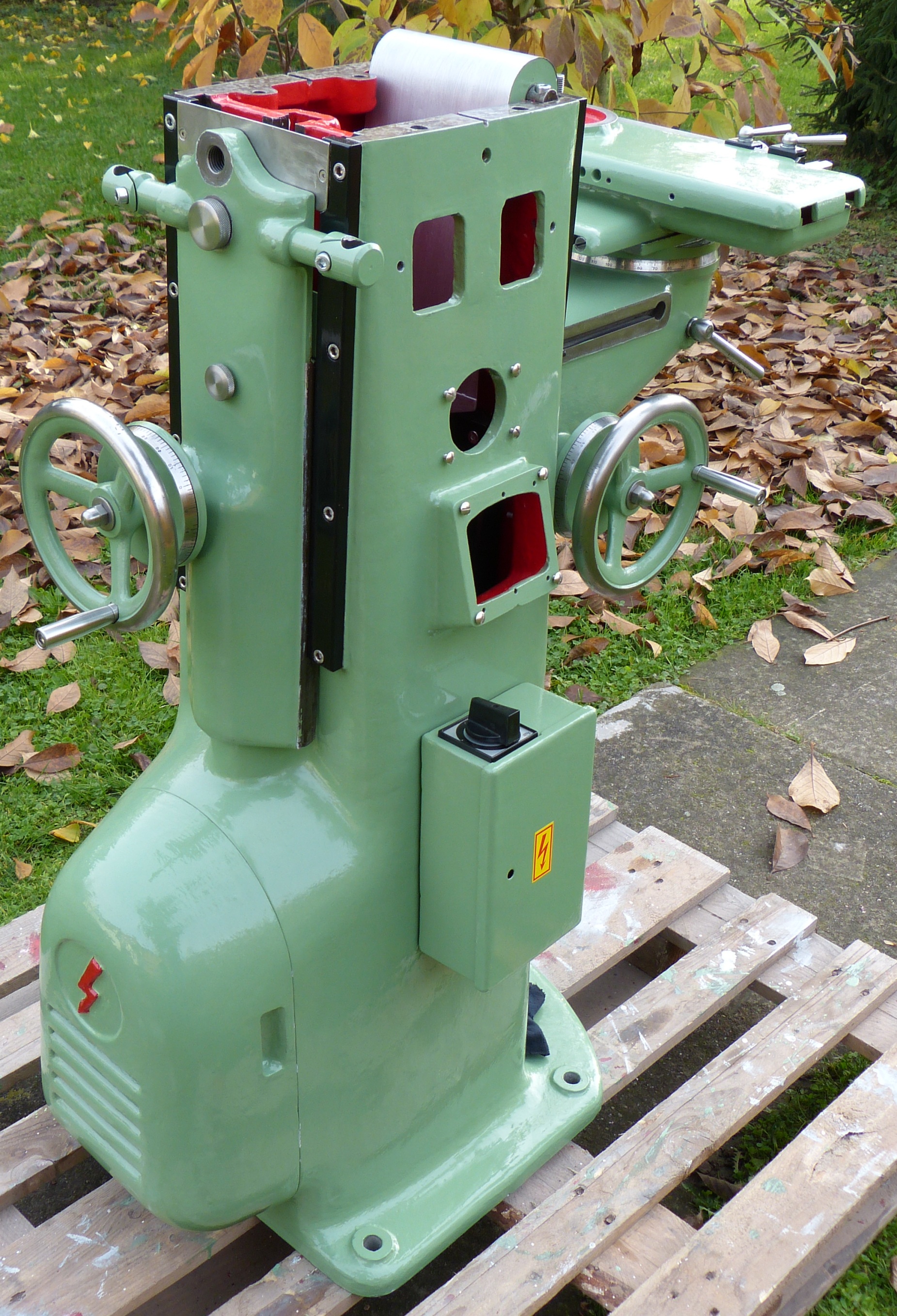Vzhledem k tomu, že si potřebuji nabrousit nástroje atd., jsem si koupil brusku N1 s nějakým příslušenstvím. Na brusce se hodně dlouho nedělalo, tak jsem ji po dovozu hned skoro celou rozdělal, barvu sundal až na kov, protože se hrozně loupala. Takže teď ji celou postupně opravuji, vyrábím chybějící díly a v závěru „štětkuji“. Co jsem zjistil, tak podélný stůl se vyráběl s vedením rybinovým nebo na kuličkách. Já mám na kuličkách, kuličky průměru 4mm princip stejný jako u hrotového přístroje (příslušenství N1). Vedení rybinové má dle manuálu rozjezd 260mm, ale kuličkové max.230mm. Jelikož já potřebuji min. 250mm pro hoblovací nože, tak jsem zezadu do stolu vyřezal dvě vybrání, abych se dostal na těch 260mm. Malá nevýhoda je teď v krytování vzadu a vpředu (dostanu se stolem více dopředu) a končící lišta seřizování jednoho dorazu.