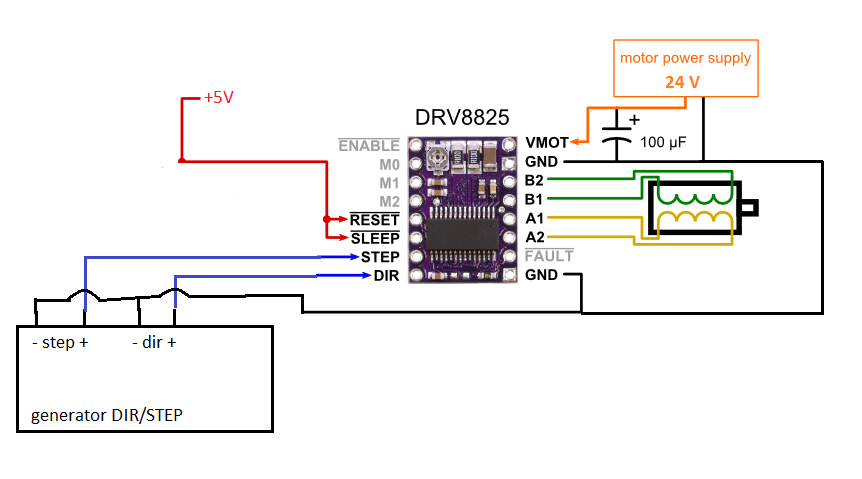 Driver DRV8825 je takto zapojený, ale motor se nechce točit pomocí generátoru DIR/STEP.