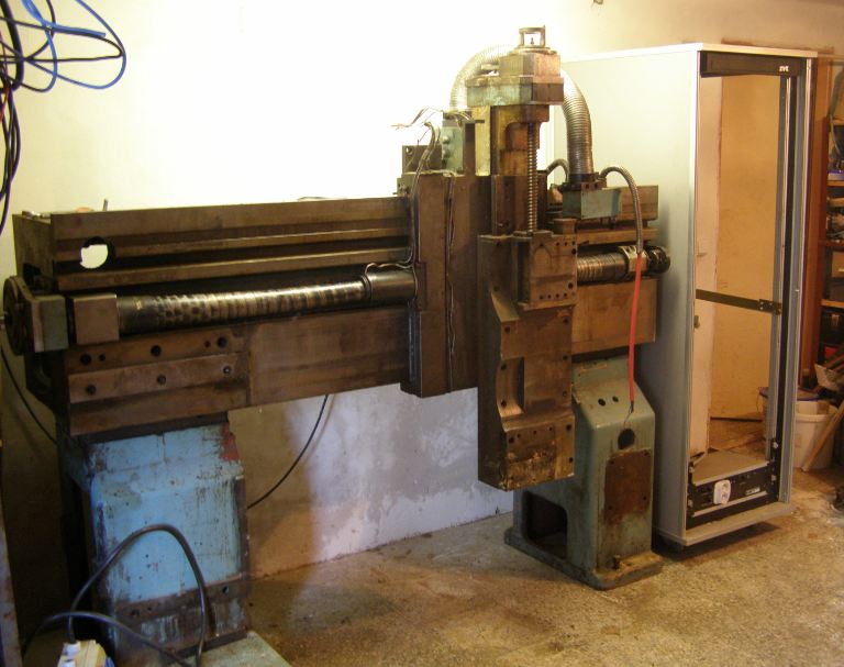..zplácanina všeho možného co mi během 5 let přišlo pod ruku. Původně lehká konstrukce ze slabých jeklů, obyčejné metrické závitové tyče, lineární posuvy z tiskáren.. časem postupně vyměněny za AC serva, kuličkové šrouby a nové lineáry. Bohužel původní konstrukce z jeklů zůstala původní, takže celková tuhost nic moc.