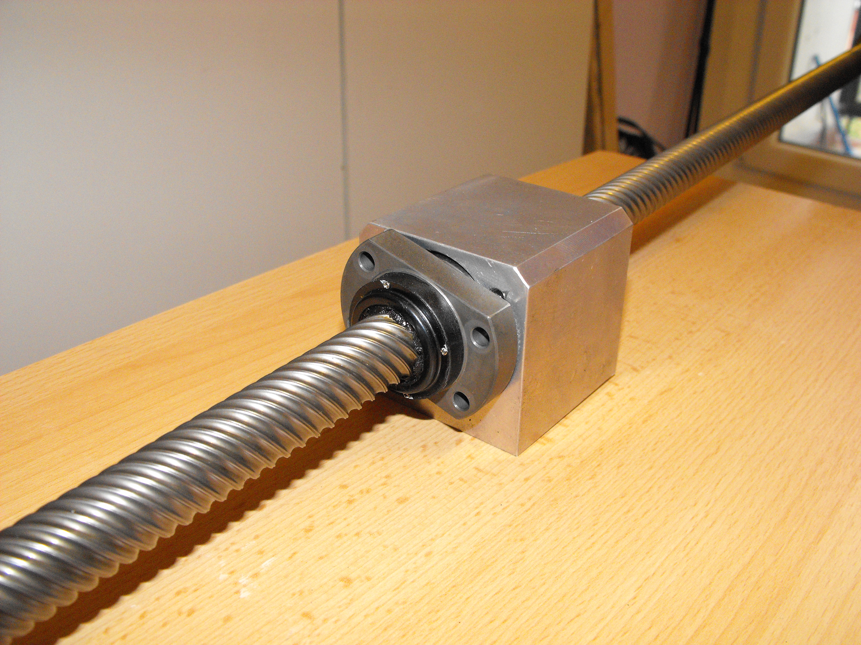 Kuličkový šroub má průměr 20mm a stoupání 40mm, závit 1400mm. Dlouhá matice bez vůle. Domek pro matici a zarážky pro krajní polohy.