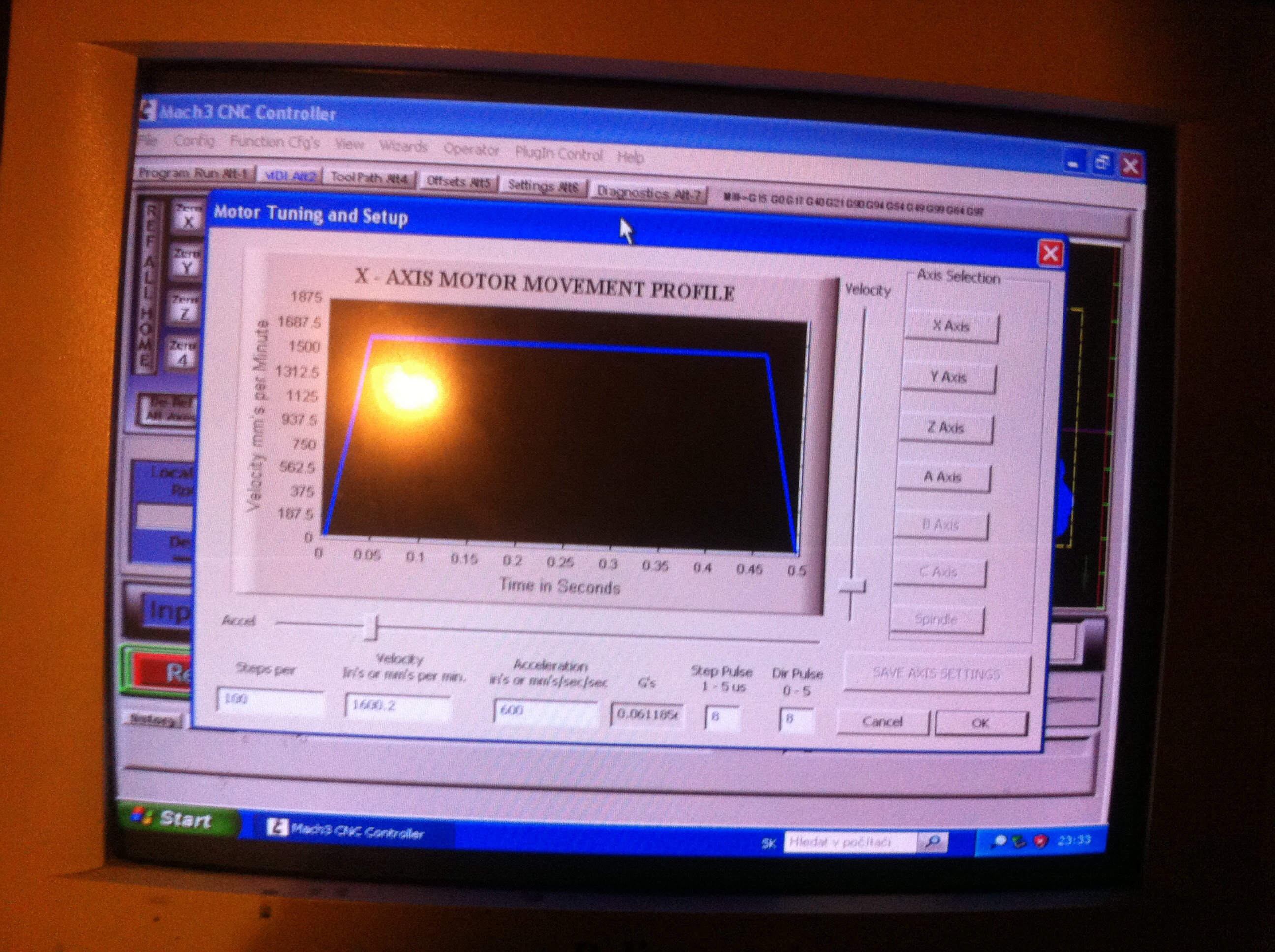 Skúšal som tú spojku a vyzerá byť v poriadku. Skúšal som vyrezávať kruh priemeru 120 mm z preglejky hrubej 4 mm - záber 2 mm takže to prešlo na dva krát a odchýlka bola 3mm. Skúšal som dávať aj iné rampy aj meniť dir puls a step puls ale akoby to ani nereagovalo. Nemohol by to byť aj vadný motor?