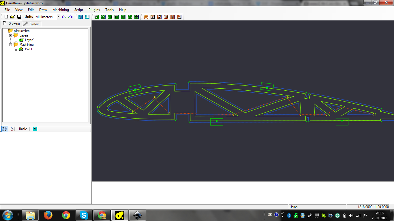 Můj postup je že převádím svg soubor do dxf a ten následně zpracuji v CamBam, ale všechny oblouky mi to rozseká na hromadu krátkých obloučku a mini čar. To je ve výsledku vidět právě na střídání modrých a zelených čar. Nicméně ale nic není rozpojené, tvar je na 100% uzavřený, jen se ve výsledku obrábění skládá z neustálých rozjezdů a zastavování, což se projevuje nepříjemnými vibracemi a nepěkným povrchem. Nevíte někdo prosím jak se toho zbavit?