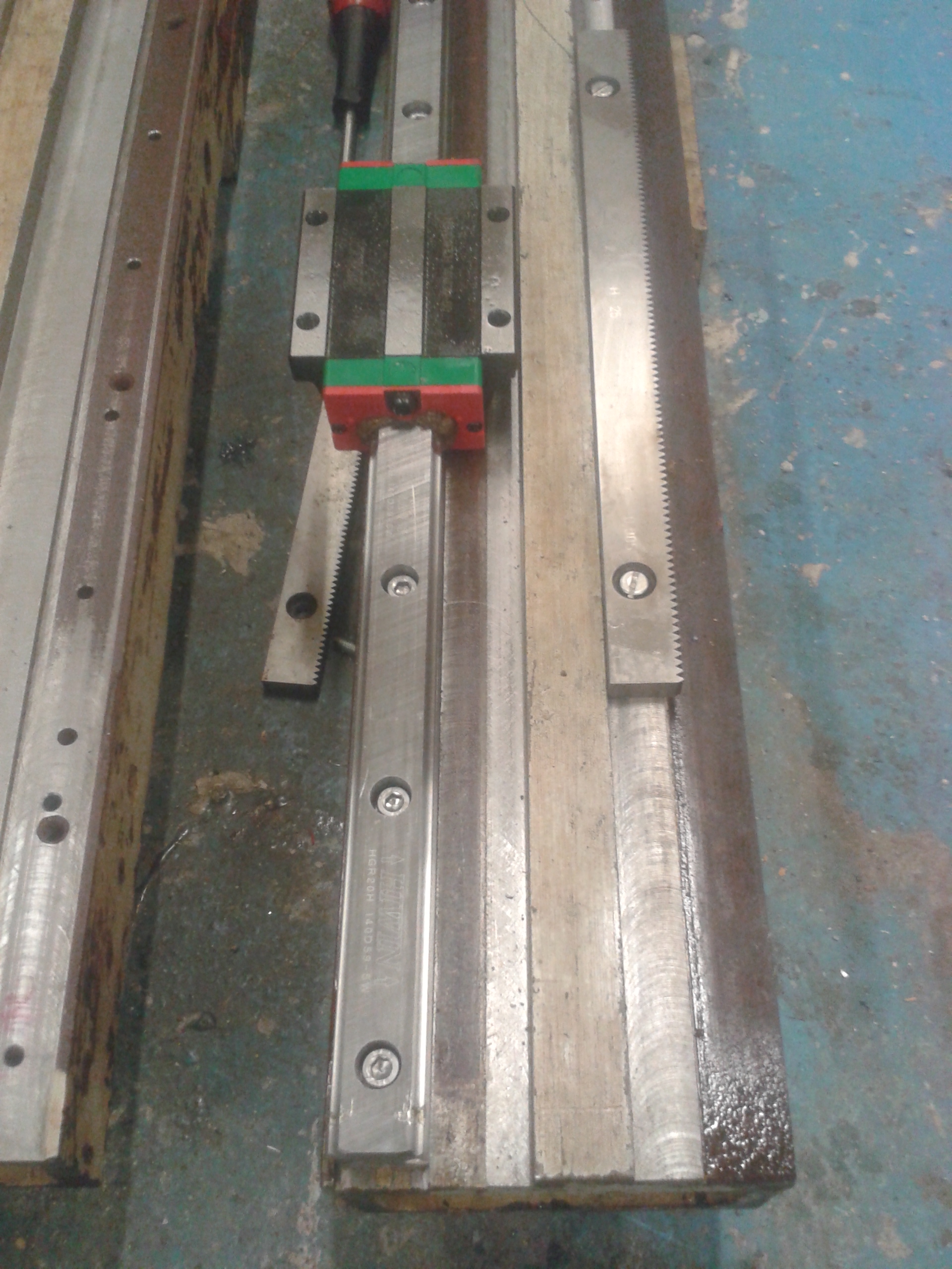 délka základny 2200mm také s hřebeny. Použité hřebeny z Aritmy ( broušené) a origo předepnutá převodovka s převodem 1:10. Pastorek z hlavy nevím ale je to dělané tak že jedna otočka pastorku je 100mm posunu na hřebenu. S Km jsem na podobném stroji lítal cca 8 m/min. Tohle bude na servech tak by to mohlo lítak k 20m/min.