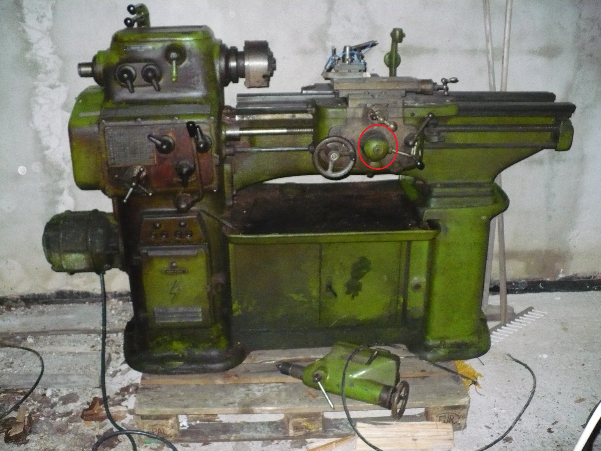 Pokud je vysypané některé axiální ložisko v mechanismu označeném kroužkem, je to současně příčinou zadrhávajícího posuvu. funguje to tak, že při natažení páky do horní polohy přitáhne tento díl přes axiální ložisko pomocí vačkového dílu hřídel procházející suportovou skříní kde spojí čelním ozubením dvě další soustředné ozubení pro přenos točivého momentu pro pohon kol skříně suportu. Předpětí spojení je seřízeno napnutím pružiny (šroubem imbus ve středu dílu) pro vypnutí posuvu při dojetí suportu na koncovou zarážku - stavitelný doraz. Možná to zní složitě, ale v příloze je to nakreslené. Později Žebrák nahradil spínáním dvou ozubených kol na jedné hřídeli třetím kolem přitlačeným pružinou, ale suport v tom provedení už neměl teto bochník, ale hranatou litinovou krabičku.