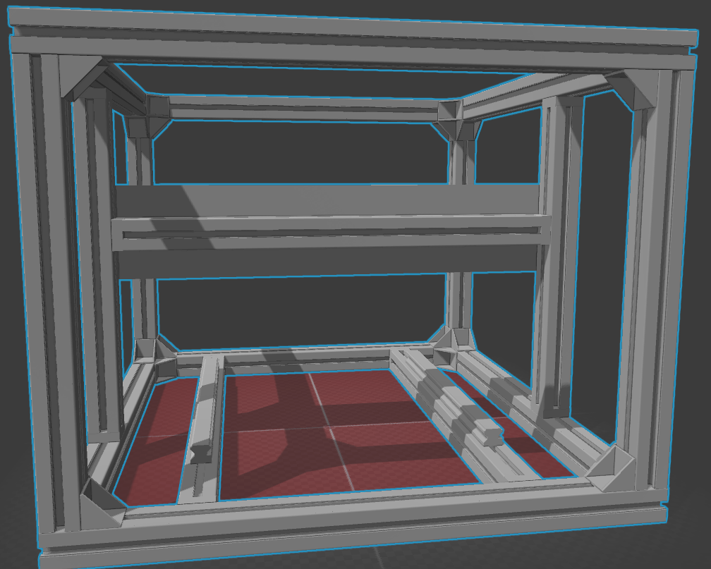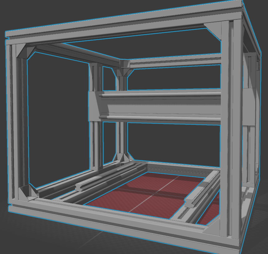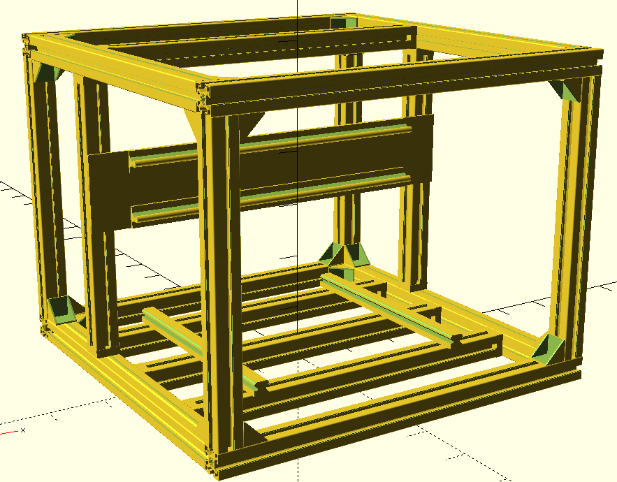 Frézku chci postavit z hliníkových válcovaných X profilů (mám k dispozici rozměry 30x30, 45x45, 60x60 a nakonec 90x90). Spojky jsou také origo celokovové a to jak rohové, tak příčné, včetně T spojovacích šroubů + další věci zdroje, celé rozvodné skříně atd. sám zatím nevím co vše tam je. Teď promýšlím konstrukci rámu. Posílám Vám obrázek modelu, jak mi to zatím vychází. Konstrukci přizpůsobuji hlavně velikostem lineárního vedení, jaké fyzicky mám a délky X profilů mohu nařezat libovolně. Model je udělaný v OpenSCad a je naprogramován, tak aby se dal pomocí parametrů snadno měnit libovolně rozměry, a přepočítají se mi ty délky profilů.