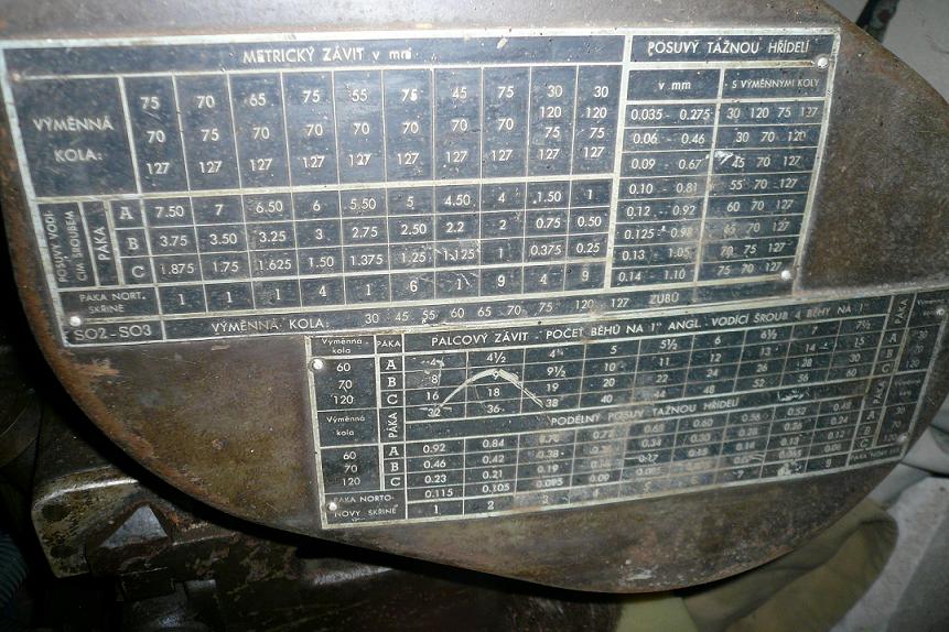 Mám však problém. Předcházející majitel zlikvidoval tabulky pro nastavení posunu při řezání závitů. Jestli je máte a mohl by