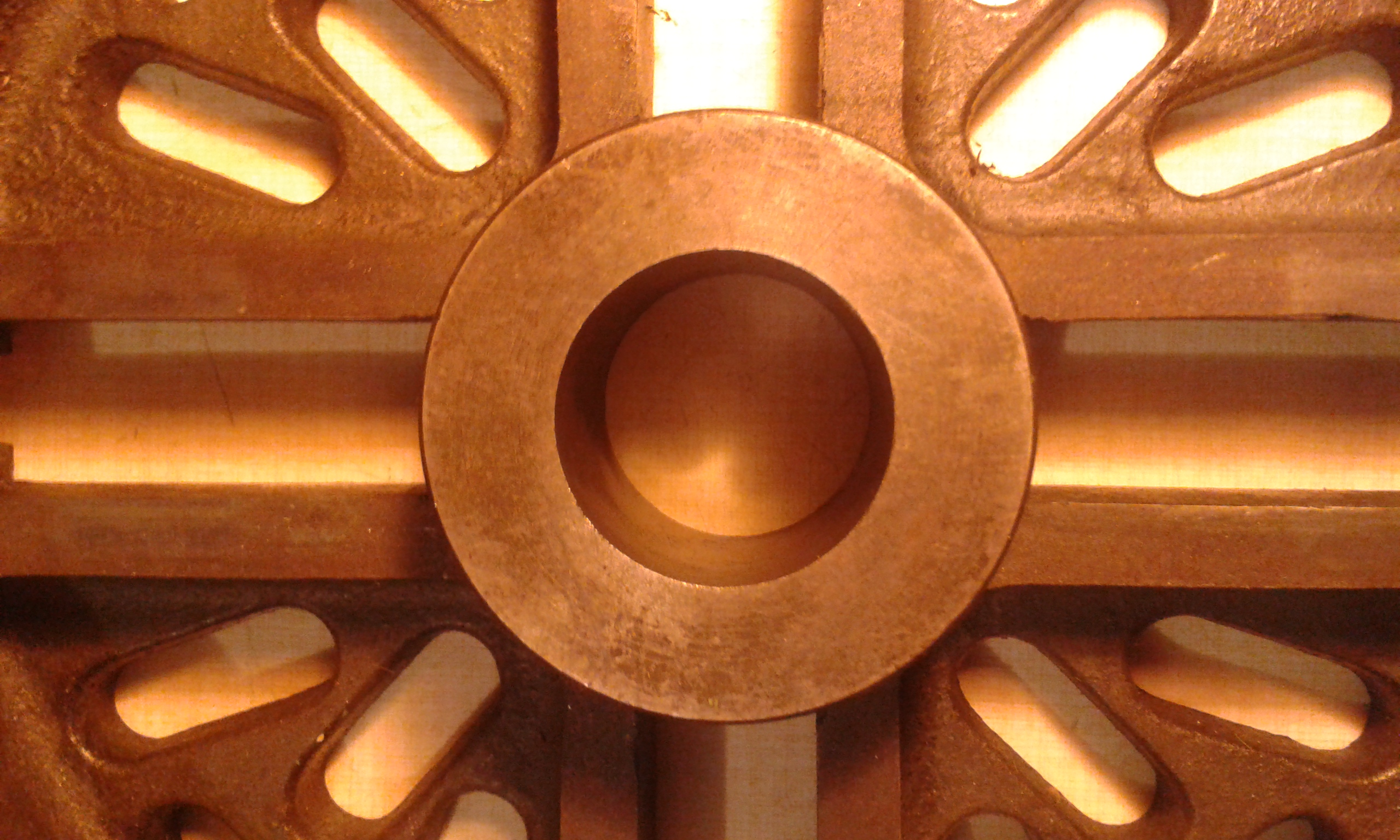 Maucta. Podařilo se mi takřka za hubičku sehnat velmi pěknou plánšajbu, akorát si drbu hlavu nad tím, jak jí upevnit na vřeteno. Díra uprostřed závit nemá a je válcová, takže vnější závit nebo kužel nee, díry na šrouby na uchycení na přírubu tam taky nejsou, otvor na červíka ze strany jsem taky nenašel. Napadají mne dvě možnosti: buď vrtnout ze strany díru na červa nebo nalisovat do díry s přesahem nějaký trn. Masa na uchycení na vřeteno je tam dost, díra v plánšajbě je průměr 38, závit na vřetenu mám 29. Ale třeba existuje nějaká jiná možnost, jak se tohle upínalo, o které netuším. Poradíte?