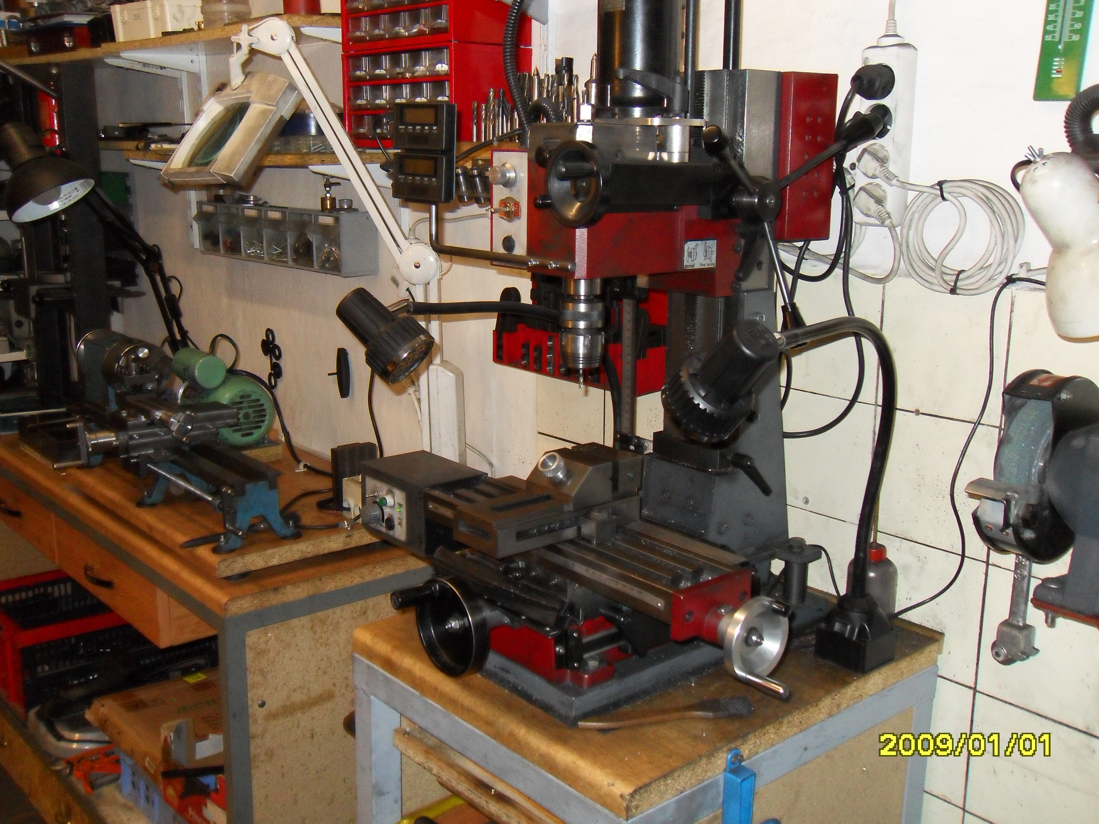 Tak moje frezka vypada dnes takto. Zakladova deska 20 mm a vystuzeny sloup. Jednoduche digitalni odmerovani a abych mohl bez obav frezovat jak sousledne, tak i nesousledne venoval jsem tomu celych 14 dnu po 5-ti hodinach zaskrabani a vymezeni vuli. Dnes je frezka schopna frezovat bez problemu zelezo coz pred upravou bylo spis tupeni nastroje nez frezovani. Srouby jsou jemny trapez 16 x 1,5 a nonius neodpovida stoupani. Jestli jsi dosud porizoval pouze aku vrtacky a pod. tak se Ti investice 25 tis. zda asi velka, ale to je jen zacatek a bude potreba daleko vic penez.