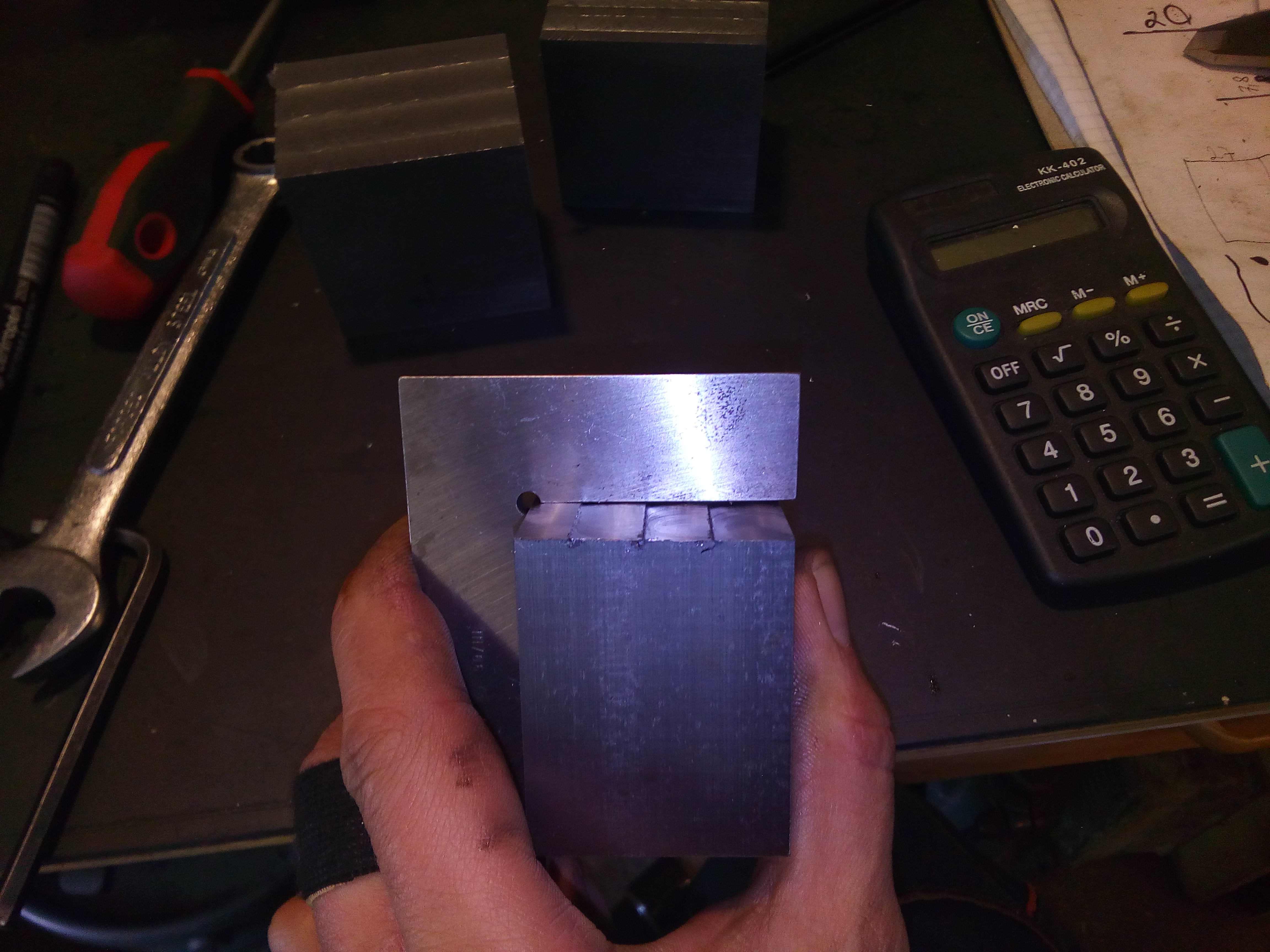Frézoval jsem toto železnou kostku stopkovou TK hrubovací frézou 14mm(upnutou v přímé kleštině), hloubka úběru 3mm na frézce F1S. Kostka byla pevně upnuta ve svěráku, všechny posuvy, kromě podélného, pevně zafixovány. A výsledná hloubka drážek v rozdílu třeba i 2mm.