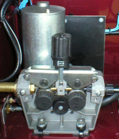 Osa motorku má šnek, na který ne těsně nasunut pastorek s modulem 1 a zajištěn imbusovým červíkem. Na ose je vybroušena ploška pro červík. Celý převod má 4 ozubená kola. Na ose šroubu je maximální průměr kola tak, aby ještě šel zakrytovat. Později pošlu foto celé setavy. Ozubená kola lze snadno zakoupit, jen je nutno na malém soustruhu dodělat souosé otvory pro hřídele. Čelo motorku je z pertinaxu a nese ložisko a uhlíky, protože původní čelo je v celku s převody pro posuv drátu. Stupňovité vybrání na pertinaxu je z důvodu snížení osy pastorku při sestavení s dalším převodem. Celý posuv se v případě získání motorku v případě rušení profi svářečky dá za pár stokorun snadno sestavit.