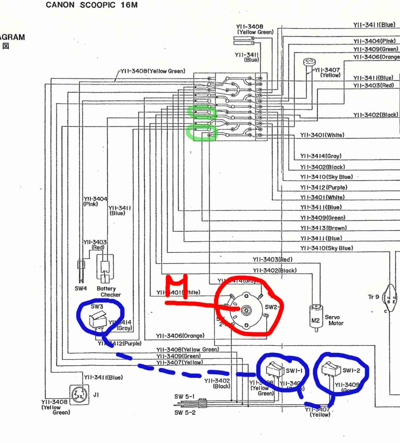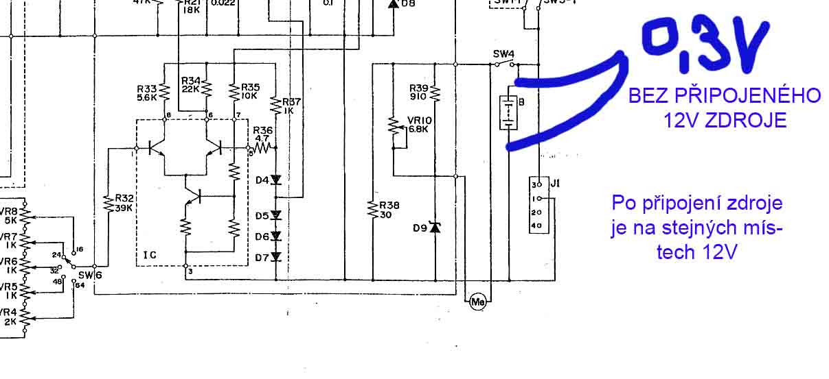 Při sepnutí hlavního spínače na Manual a posléze i tlačítka REC = (mechanicky se sepnou současně modře vyznačené... Ale na přepínači SW3 z obou směrů nic není! V zeleně zakroužkovaným jsem měřil...
