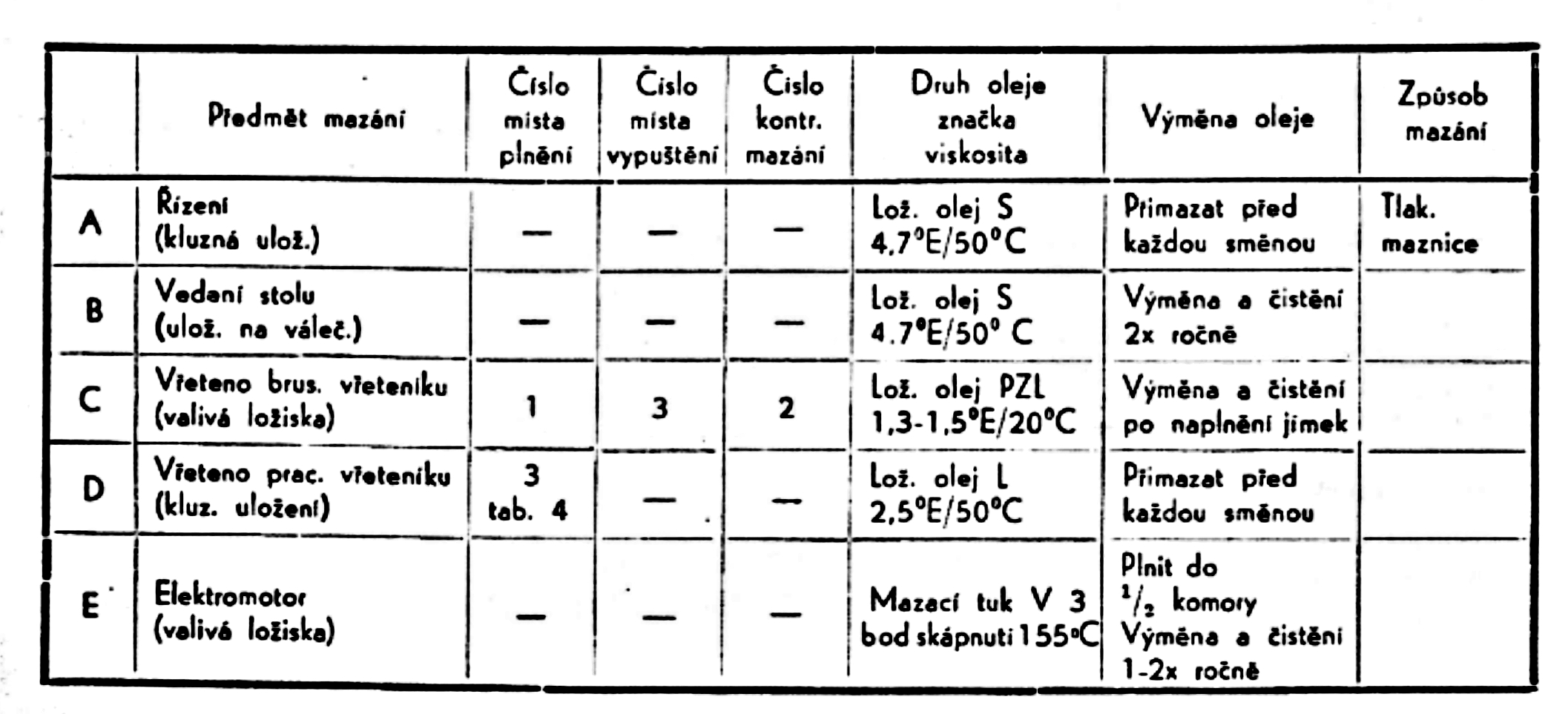 2. a ostatní 4,7°E/50°C ( v pasportu uváděné jako oleje A, B, olej D má být sice řidší ovšem myslím, že pracovnímu vřeteníku vůbec neuškodí hustší olej)