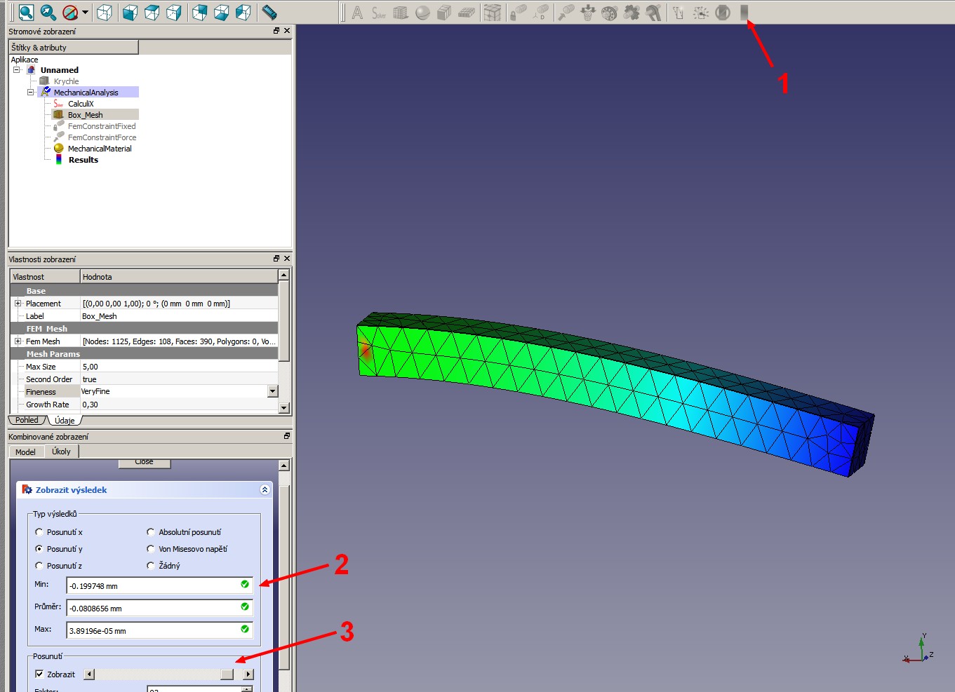 Po výpočtu porohlížíme výsledky. V pravém dolním rohu modelového prostoru máme zobrazeny směry X/Y/Z. Nás zajímá deformace ve směru y. Zaškrtneme si ho v dialogovém okně a vidíme maximální deformaci  0,2. Po zašrtnutí zobrazit posunutí si můžeme v měřítku zobrazit deformaci dílu.