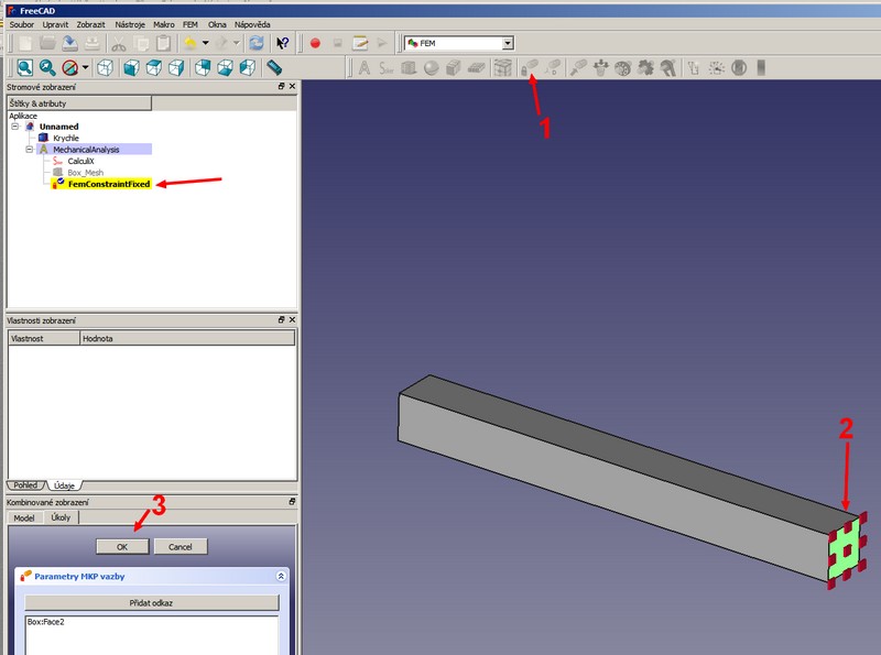 Ukotvíme jednu stranu nosníku, v našem případě počítáme vetknutý nosník. 1 - klikneme na ikonu se zámkem. 2 - označíme plochu na nosníku.3 - potvrdíme výběr OK.