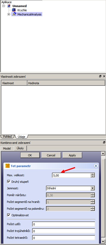 Vyskočí toto dialogové okno vysíťování dílu. Upravíme velikost prvku sítě na 5mm. Můžeme nechat nastaveno 1000 - řešič sám určí minimální počet prvků nutných pro tvorbu výpočtové sítě. Ale to bych nechal nastaveno skutečně jen pro rychlý orientační výpočet.