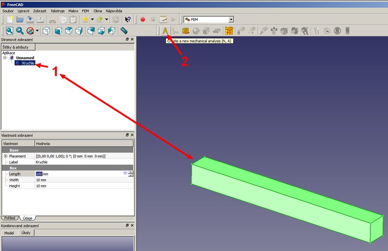Přepneme se do modulu FEM. 1 - ve stromě označíme díl. 2 - klikneme na ikonu A.