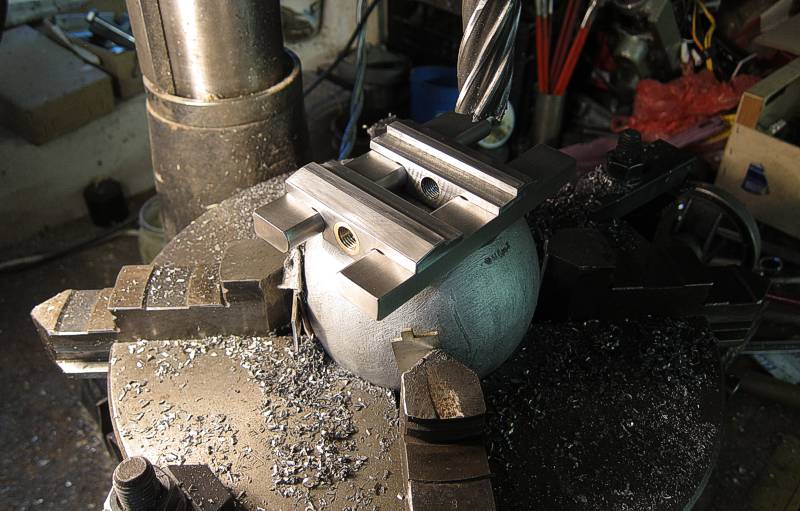 Je to normální vrhačská koule pro muže, 7,62Kg za cca 500kč , průměr něco nad 100mm. Domníval jsem se že bude litinová, ale je to měkká ocel, takže jsem to chytil do 300mm univerzálky a šup s tím na frézu. Kousek jsem seříznul pilkou a lože pro to vedení a drážku pro šroub už normálně frézoval. :)