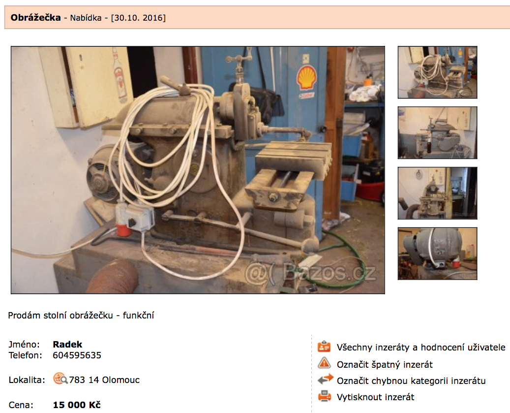 A další šeping k mání. Říkám si, co je těhlech malých obrážeček po republice mezi lidma. Původně jsem ji taky chtěl, nakonec jsem ale usoudil, že budu číhat na nějakou větší, na čem půjde přerovnat i nějaká větší plocha. Tak třeba někdo další si odsud udělá radost. I když za tyhle prachy už to je asi přes čáru. 8)