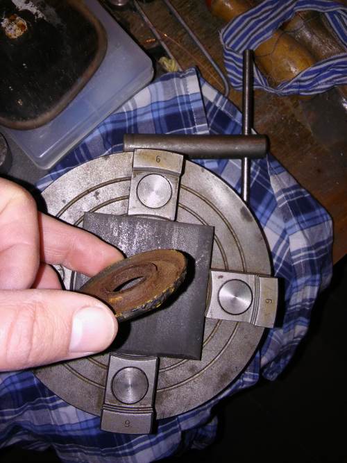 Na ten plochac obkresli tu podlozku, naznac priblizny stred, flexou orez hrany aby vznikol mnohouholnik. navrtaj dieru,strc tam M12 skrutku s driekom. flexou odrez hlavu z M12 skrutky. Natoc jednu maticu M12 zaloz orezany plech dotihmi druhou M12. Mozes sustruzit. Ked osustruzis ten mnoho uholnik. Upni to normalne za vonkajsok, vysustruz vybratie a zarovnaj povrch a vnutornu dieru.