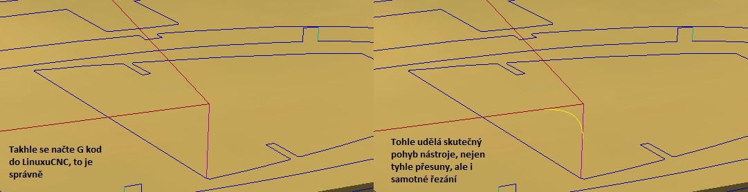 Možná je to prkotina, ale dnes jsem si všiml, že když nahraju Gkód do linuxcnc, tak se mi zobrazí jak má, ale když simuluju pohyb frézky, tak mi ze všech "ostrých rohů" ( i včetně přesunu nástroje ) udělá rádiusy.