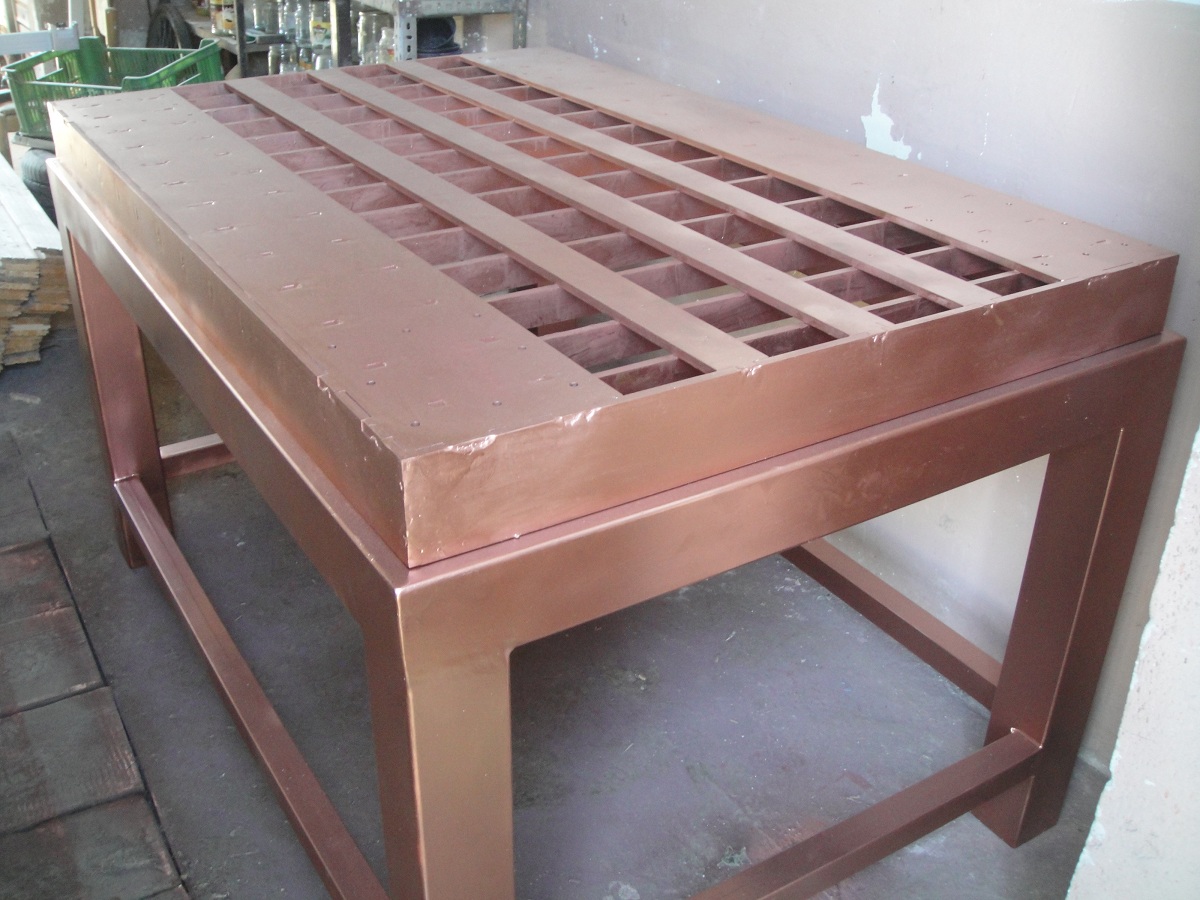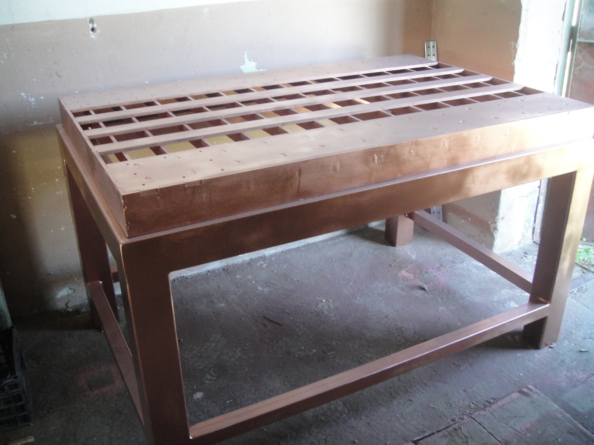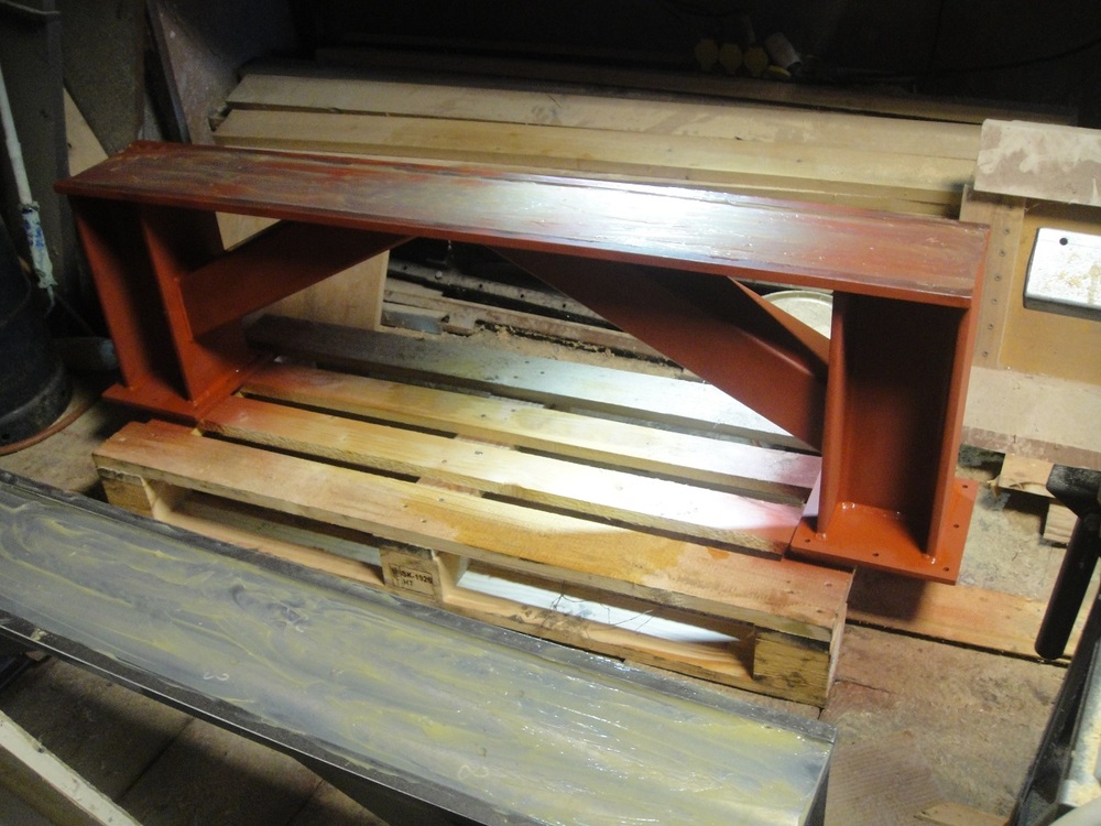 Noha je pozvarana z beznych profilov a obrobena na freze.Neskor sa bude este brusit.Fotky su trocha z blbych uhlov, lebo som nohy po nastriekani zakladnou farbou musel odlozit na zimu do kuta.