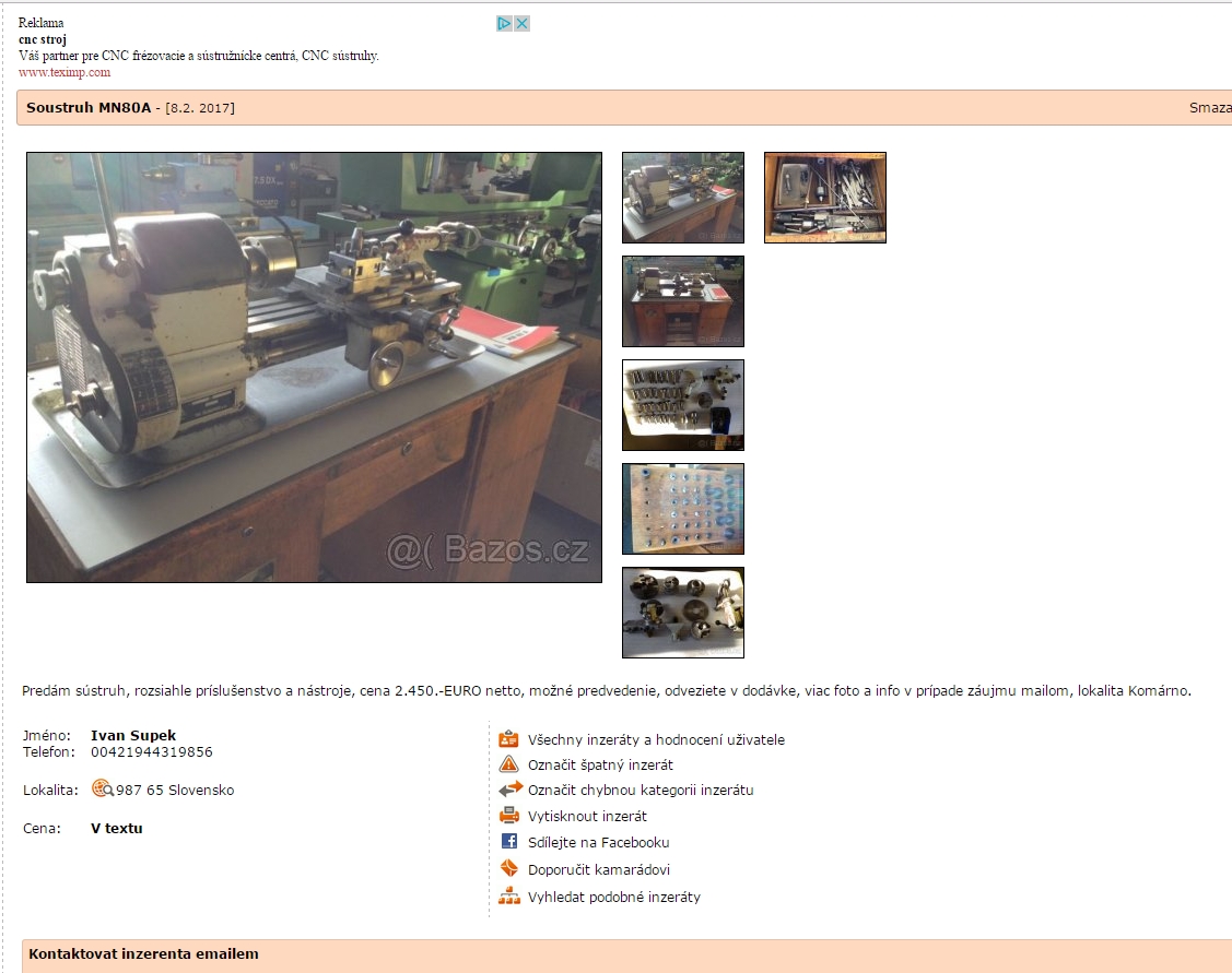 Ze stolních soustruhů jsem nenarazil na nic lepšího. Minulý rok mi jeden člověk z Chomutova nabízel krásnou mašinku z Anglie, ale problém - vše v palcích. I ten kužel v koníku byl nějakej divnej. Věřím tomu, že za pár let bude Mn80 za 100t a více. Je sice pravda, že se stroje objevují, ale !!!! Buď velké, nebo příšerné sračky, nebo od překupníků za naprosto absurdní ceny a nebo je na ně 50 vlčáků, kteří přihazují jeden přes druhého. Pak to jeden koupí a ostatní si stěžujou, že prodejce je hajzl.