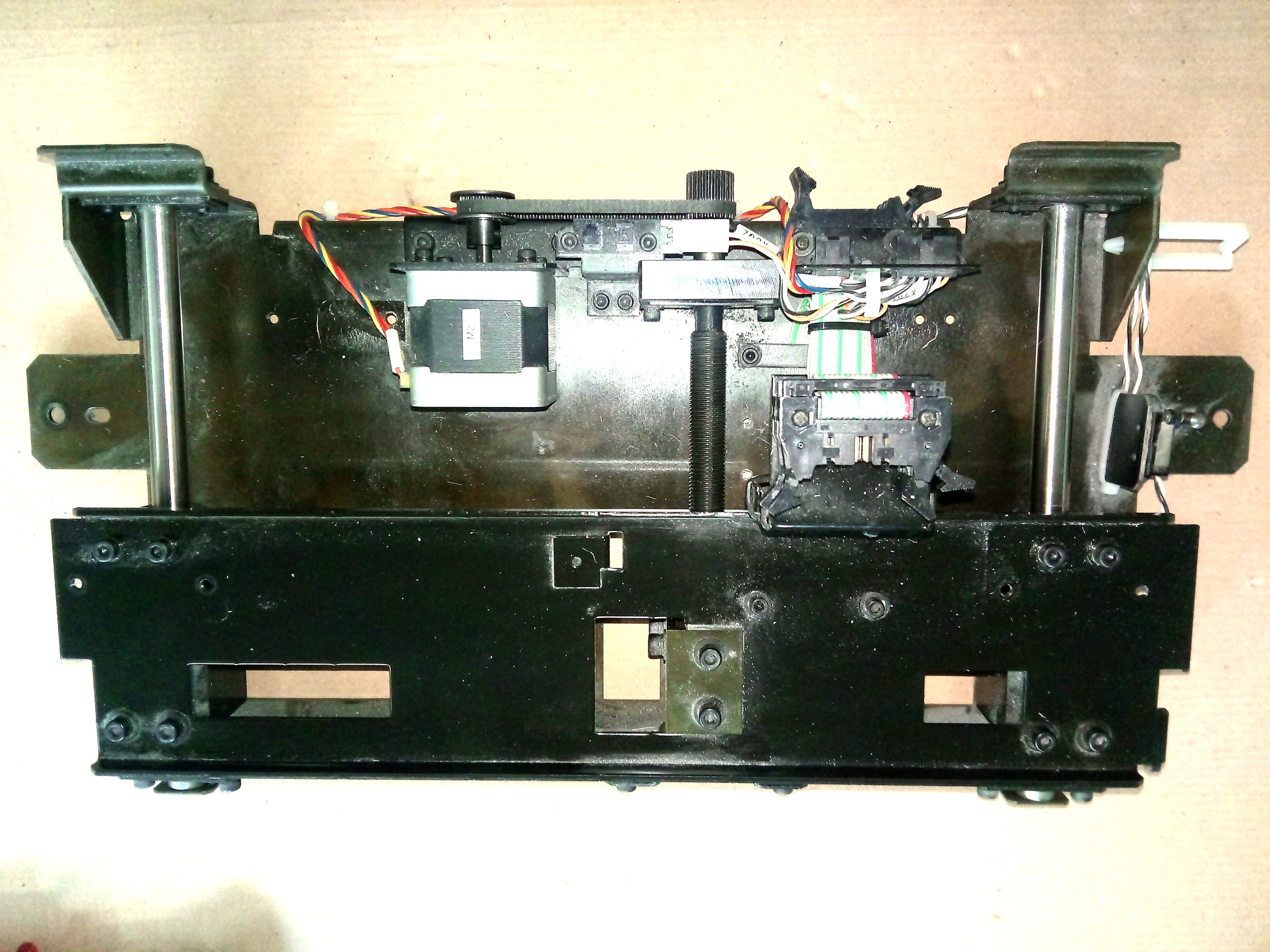 Mechanika, použitelná na osu Z: rozměr cca 420mmx 215mm x 70mm (bez držáku kabelů), rozjezd 100mm, obsahuje dva limit switche (mikrospínače) 1x optickou závoru (referák), nepodepřené tyče průměr 12mm s 2 kuličkovými vozíky každá, šroub průměr 12mm s jemným stoupáním (cca 1-1,25mm - nemám jak přesně změřit), matice mosaz nebo bronz. Krokový motor je dvoufázový unipolární (4 vývody). Veškerá elektronika vyvedena na konektory.
