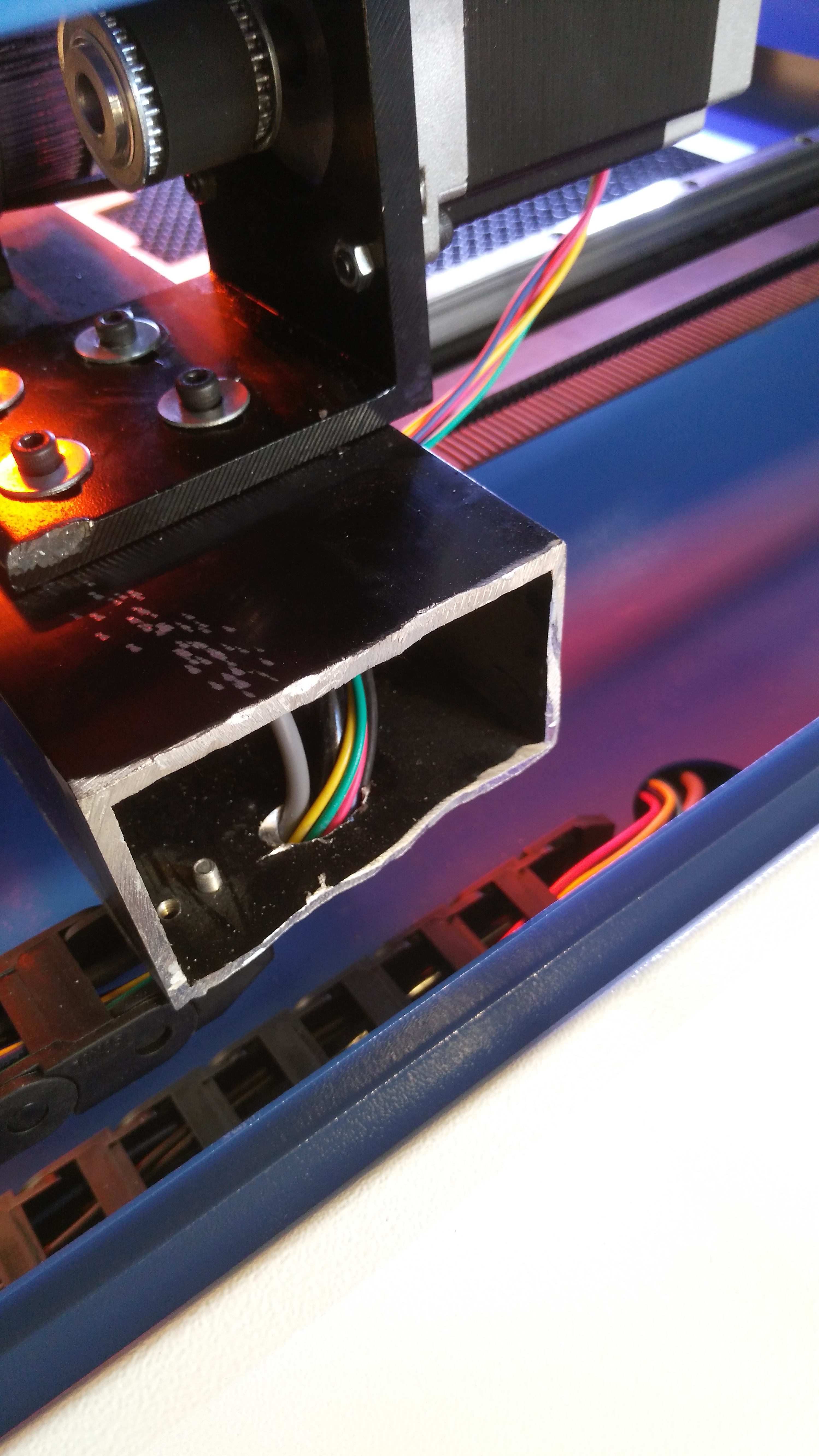 Tak jsem toto zatím odložil a že zkontroluju geometrii. To byla další velká chyba. To jsem měl udělat jako první a ne se zdržovat se zrcátkama. To, že se na vozíky lineárního vedení dá dostat jen když se sundají držáky řemenu X ka je drobnost. Profil někdo zkratil metodou, která mi není známa a nenapadá mě jak bych toho docílil ( myslím, že i kdybych ten profil brousil o obrubník dosáhl bych lepšího výsledku ). Po zjištění že kolmost není ani v ose X ani ose Y jsem měl chut to rozkopat. Na řemenice pro Y se nedá dostat ( červík je zevnitř na malý plochý šroubovák, který se tam nedá dostat natož abych to povolil. X kové vední je na železném profilu 40x40, ke kterému jsou přivařené destičky , které mají oválné díry aby bylo možné je seštelovat do kolma. No to by bylo fajn jen kdyby křovák do základny laseru neudělal závity tak že se halva šroubu opírá o profil a nedovoluje tak pohyb na jednu stranu ( zrovna tu na kterou bych potřeboval). To že je to kosmický materiál a při utahování šroubu s válcovou hlavou si v této destičce udělá hlava šrobu cca 1-2mm zahloubení je asi bonus. Následně jsem též zjistil že místní metodu montování kolejnice na al profil čínan značně vylepšil. X ková kolejnice je na profilu který má 2.5, možná 3 mm stěnu. Přišroubovaná je tak nějak od oka skoro rovnoběžně s hranou profilu ( 5 desetin šikmo). Co se ale úplně nepovedlo je jeden konec ,kdy cca 200mm od kraje kolejnice uhýbá asi o 1mm ( je zkrátka ohlá a umělec udělal díry a závity podle ní). Poslední díra a závit byl z osy o 2 mm a mám pocit že v něm i zlomil závitník tedy tam šroub ani nedal.