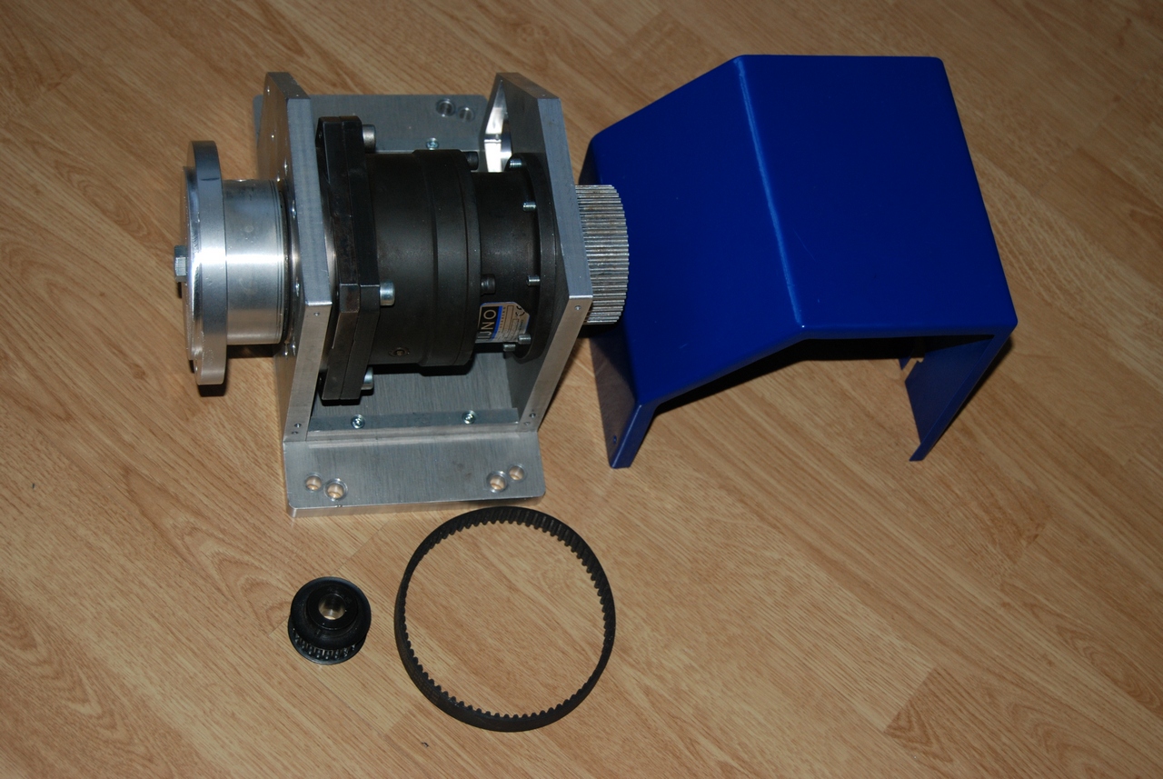Základ je robotická převodovka MIJNO (asi planeta) s převodem 1:7 s výstupem na řemen 5M. Tam jsem měl ještě převod 1:2 (lze ale i jinak). Na převodovce je příruba pro univerzálku TOS 125.
