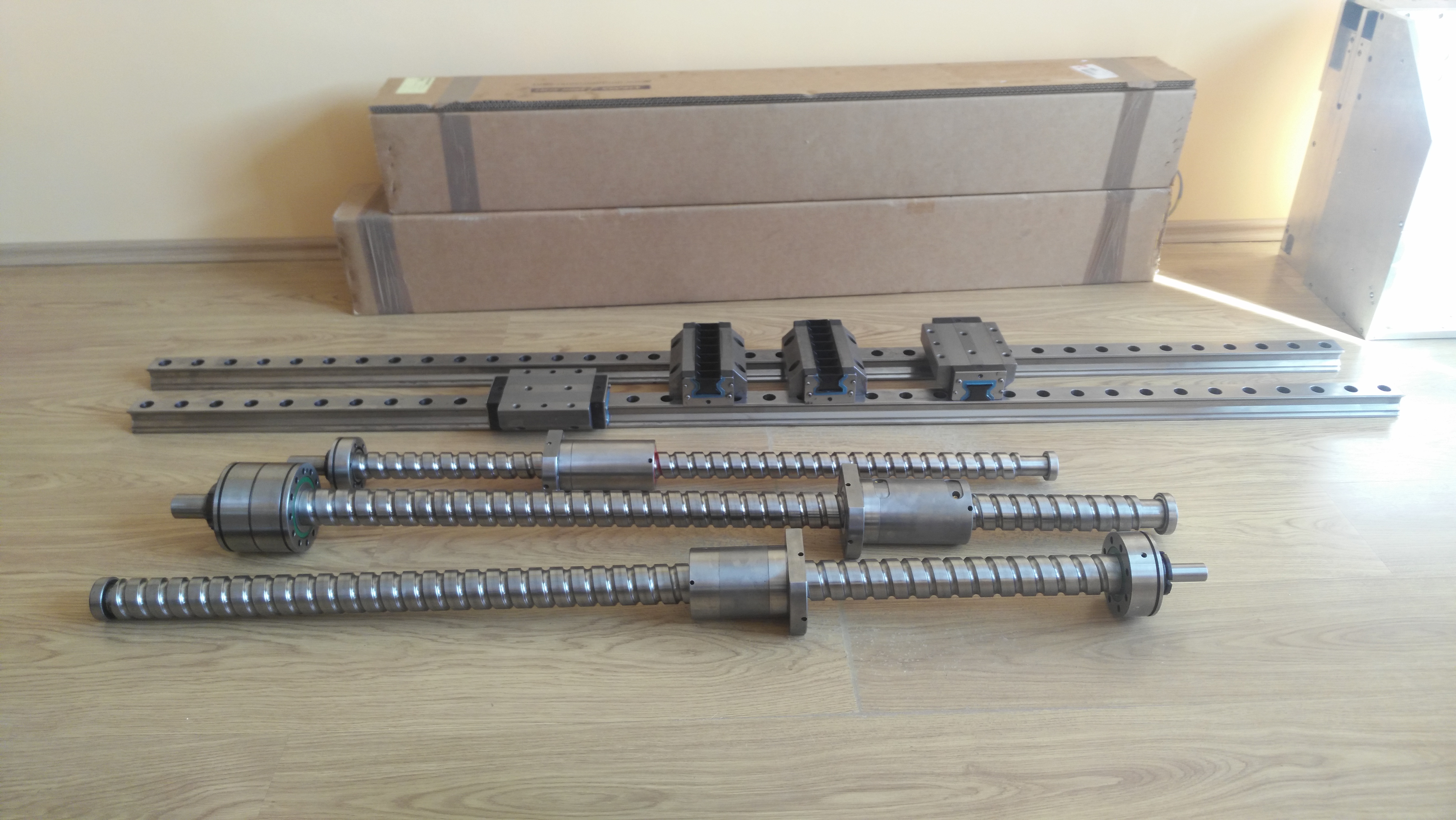 Jedná sa o 2 koľajnice a 4 vozíky. Jazdí to úplne tuho, žiadna vôľa, žiadne zadrhávanie. Dĺžka koľajníc 1940mm. Lineári boli ako Y na DMF250. Po asi 7 rokoch prevádzky boli vymenené spolu so skrutkou pre os Y aj Z. Po tých rokoch to malo za sebou pár nárazy, hádzali na pojazde 900mm cca 12mm. Ale ako som predpokladal, bolo to len v uchytení lineárov, samotne lineári som premeriaval a sú rovné. (video, drážka má 45,02 a lineár 45 +- pár tisícin, takže tých +-0,01mm sa môže odrátať)