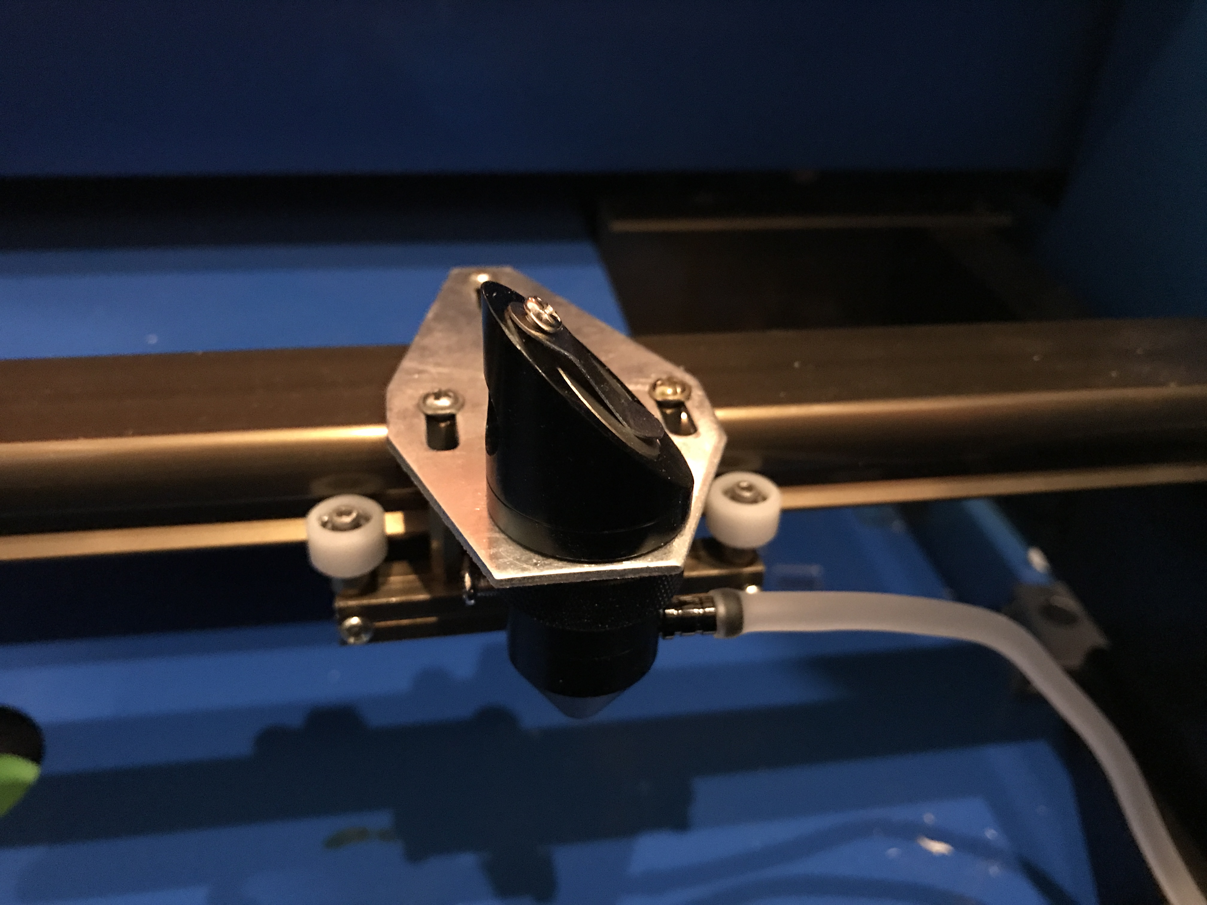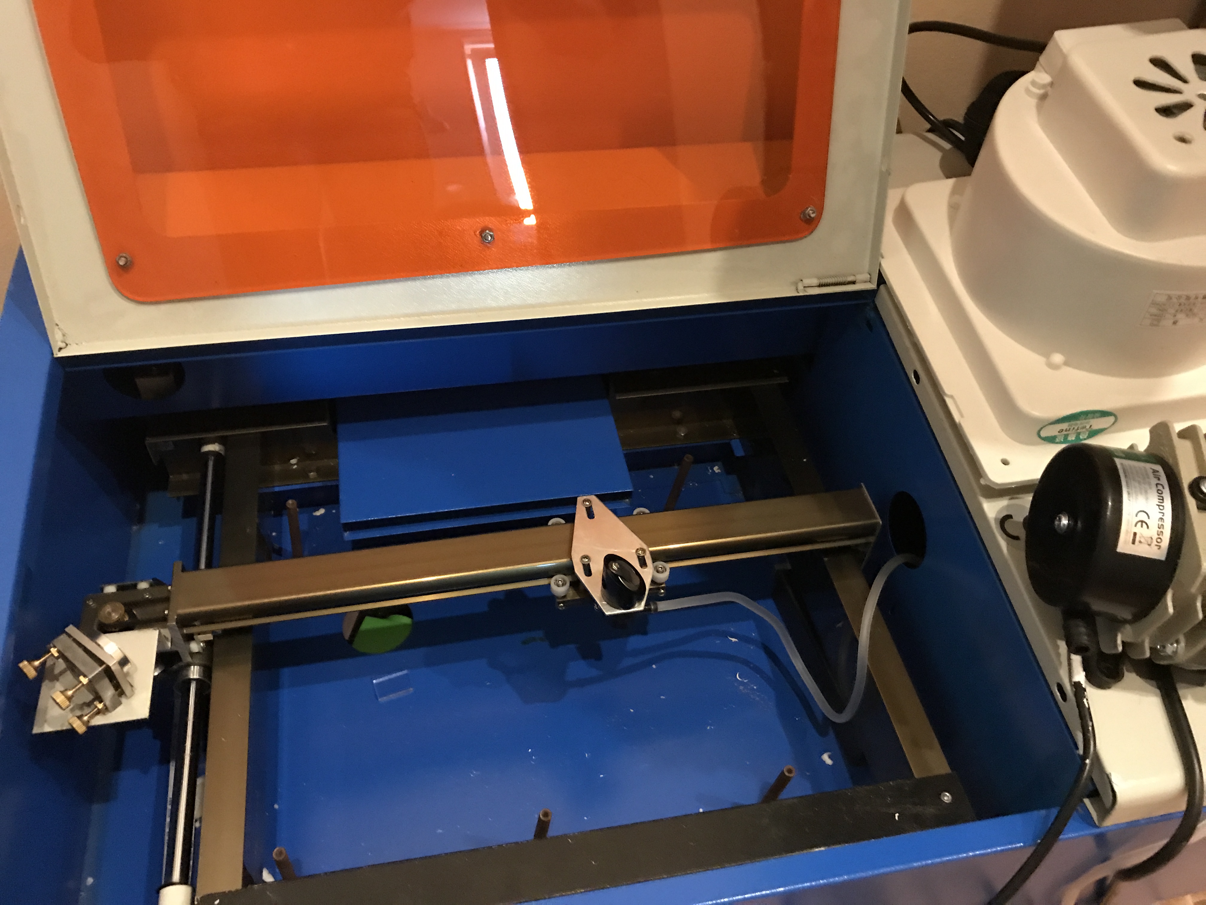 Přítlačný stůl (resp. držák na gumičku k výrobě razítek, což byl snad prapůvodní smysl K40) jsem odmontoval, ale je možné ho zpět přidělat. Stolek se mi již nechtělo vyrábět, tak jsem to řešil trochu provizorně podložením vším možným. Nejsem si teď taky jist, jestli upgradovaná čočka nemá jinou ohniskovou vzdálenost než původní (takže s orig. držákem byl materiál mimo fokus?), kažopadně nějaký primitivní stavitelný stolek s voštinou stejně bude potřeba dodělat.