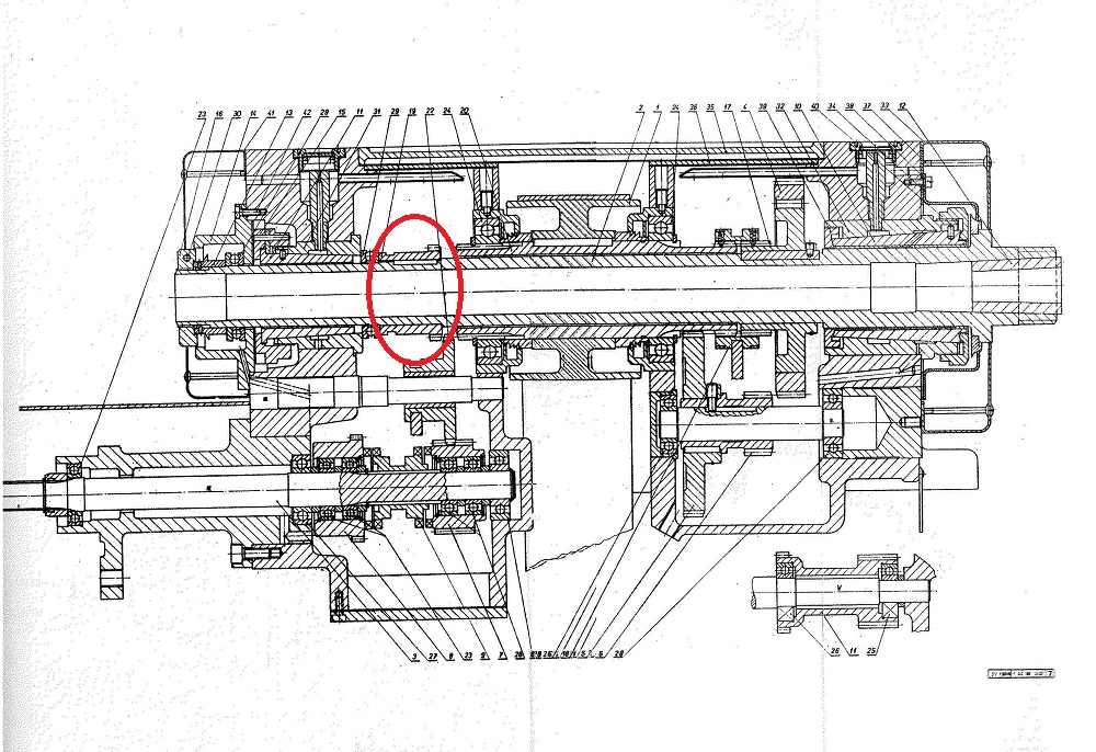 Trochu som v tom pohrabal a problém sa podarilo vyriešiť. Nie som si istý, či to mohlo byť spôsobené tým, ale pri skladaní vreteníka sa mi podarilo (ozubeným kolieskom vyznačenom na obrázku) odhobľovať šponu z hriadeľového pera ktoré som menil. Túto šponu po dorazení vretena zatlačilo medzi spomínané ozubené koliesko a osadenie na vretene. Keďže som to nepovažoval za dôležité a nechcelo sa mi vreteno nazad vytrepávať, nechal som ju tam.