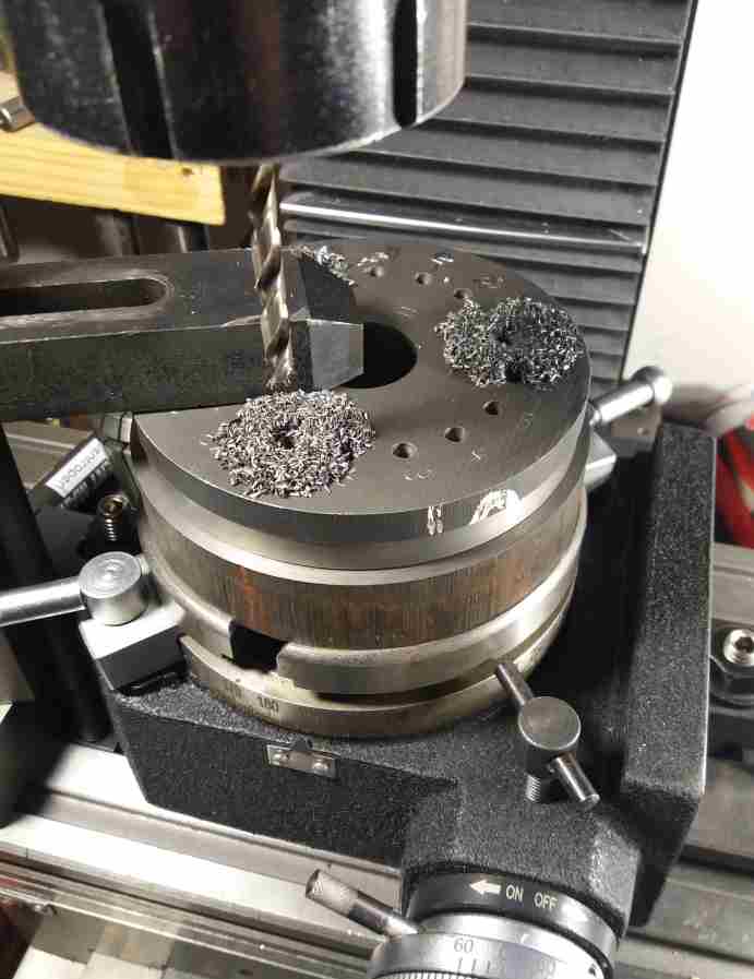 Pak bylo nutné připravit vrtací otvory jako šablonu - bohužel jsem neuměl přesně odměřit tak jsem přípravek umístil na děličku vycentroval na 0,01 mm a vrtal po 0,2 poloměru po 20° viz obrázek.