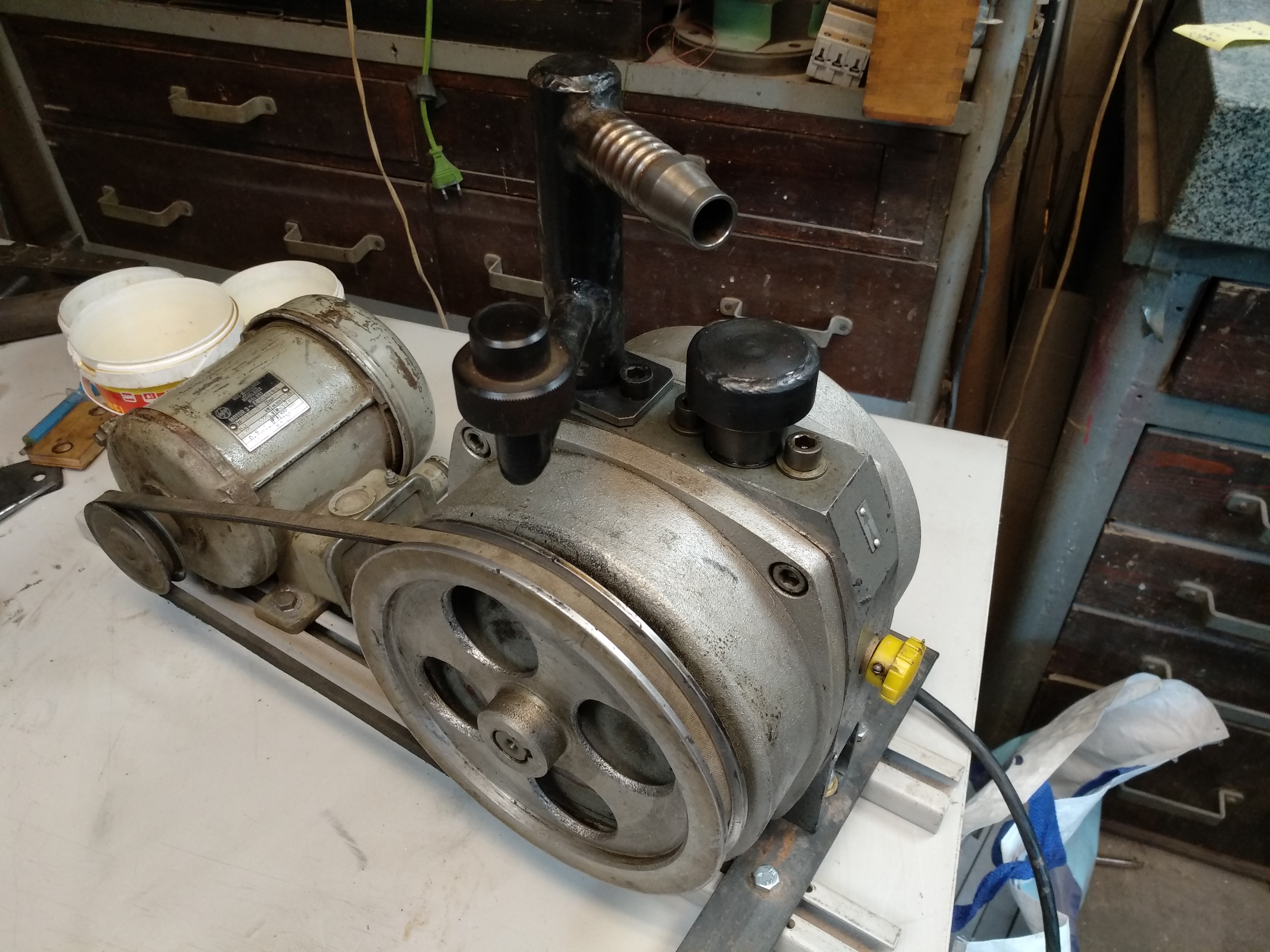 Tak snadné to není protože tu sestavu jsem zbastlil z motoru a řemenice co jsem měl doma - jen pro vyzkoušení funkce. Rozebírat ji nechci, protože je údajně po GO a běží dobře, jen bez zatížení z ní jde olejová mlha a to je asi vlastnost olejových vývěv.Mex píše:Na co je žlutý cuplík nevím, ale skoro bych řekl, že by se to mělo dát snadno poznat (na tak jednoduchém stroji jako je vývěva).