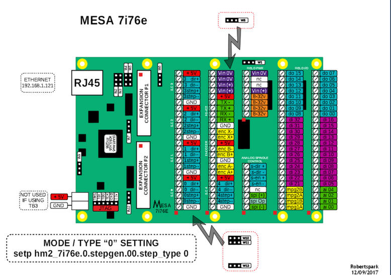 Mesa 7i76e ma v sobe dva sserial porty, jeden složí pro řízení IO vstupu/výstupů na vykonové časti karty (natvrdo nadratovan v karte) a druhy je k dispozici pro pripojení externi sserial karty. Problém je v tom, že vystup je diferencialní kvuli rušení a STM32 potřebuje nediferencialní. Takže jeste bylo potreba si napsat vlastni firmware pro 7i76e tak aby pribyl dalsi SSerial na portu P1 nebo p2.
