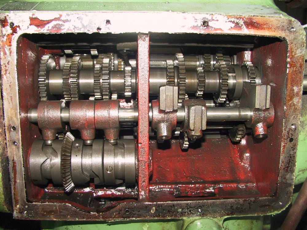 Nejdříve jsem si nastavil páky do neutrálních poloh, pak jsem si po sundání víka poznačil jak kola jsou, raději jsem zvolil opatrný postup. Potom jsem si odzkoušel co dělá co, abych porozuměl jak to funguje a nakonec prohlédnul zuby, zda není viditelně požkozený. Zkusil jsem vůle na ložiskách, kam jsem se dostal. Vše se jevilo dobře, tak jsem si zapřel suport a rukou utáčel vřetenem a postupně odzkoušel všechny kombinace strojních posuvů. Vše fungovalo jak má. Mrknul jsem na víko a zjistil jsem, že je zalepené bordelem kolo co přepíná posuvy a to zejména dírka kam zapadá kulička při řazení. Vše jsem vyčistil sesadil a spustil soustruh a opět odzkoušel strojní posuvy. Řazení rychlosti posuvů je teď mnohem přesnější, chyba tedy bylo v špatně zařazeném stupni, popravdě mám i podezření. že kolečko co ukazuje rychlost, bylo posunuté.