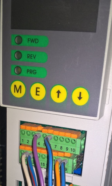 Na měniči byli původně připojeny dráty. Jedením se spíná pohon (Ten mi funguje. Kdyz na něj připojím 24 V, tak se měnič roztočí naplno), druhý by měl být analogový vstup. Když na něj připojím 0-10 V, tak se nic nezmění.