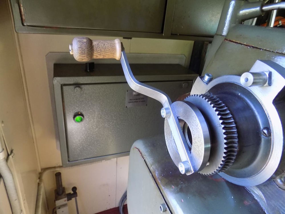(Ozubenému kolu na zadním konci vřetena se nediv - to je součástí vřetenové děličky, protože k mašině mám výškově posuvné frézovací vřeteno - a využil jsem této sestavy pro připnutí kliky.)