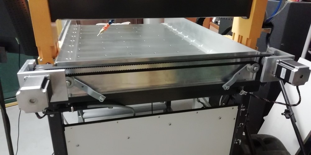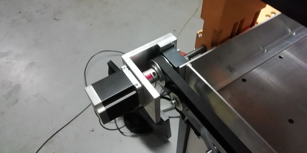 Uznal jsem, že tudy cesta nevede, a šel do trošku jistější konstrukce. Vše je na podepřených tyčích jen osa Z zůstala na nepodepřených D20 s rozsahem 140mm. Osa X má 550mm rozjezd a osa Y 900mm. Vše je poháněno motory 23HS8430 přes pružnou spojku rovnou na trapézový šroub M12/3. Použil jsem předepnuté matice a stroj je až překvapivě tuhý. Měl jsem strach, že most o váze 52Kg bez vřetena to neutáhne ale opak je pravdou. Používám dělení kroku 1/4 vše je ovládáno přes LPT port. Celková váha je víc jak 230kg jen deska stolu váží 120Kg. Osa Y je poháněna po stranách dvěma šrouby, nakonec jsem oba spojit ozubeným řemenem a poháním to zatím jen jedním motorem. Původně jsem chtěl použít dva ale měl jsem strach z křížení mostu kdyby jeden vynechal krok. Není to ještě zcela hotové, chybí zapojit koncové spínače, nějaké kryty, ofuk či odsávání a pár estetických úprav ale jezdí to zkušebně dobře. Hlavní využití bude na gravírování, první pokusy s fixou místo frézy jsou úžasné. Uvidíme jak se to bude chovat při samotném frézování. Momentálně přecházím z Mach3 na LinuxCNC. Mach jsem měl jen v omezené verzi ale i tak to na první pokusy stačilo.
