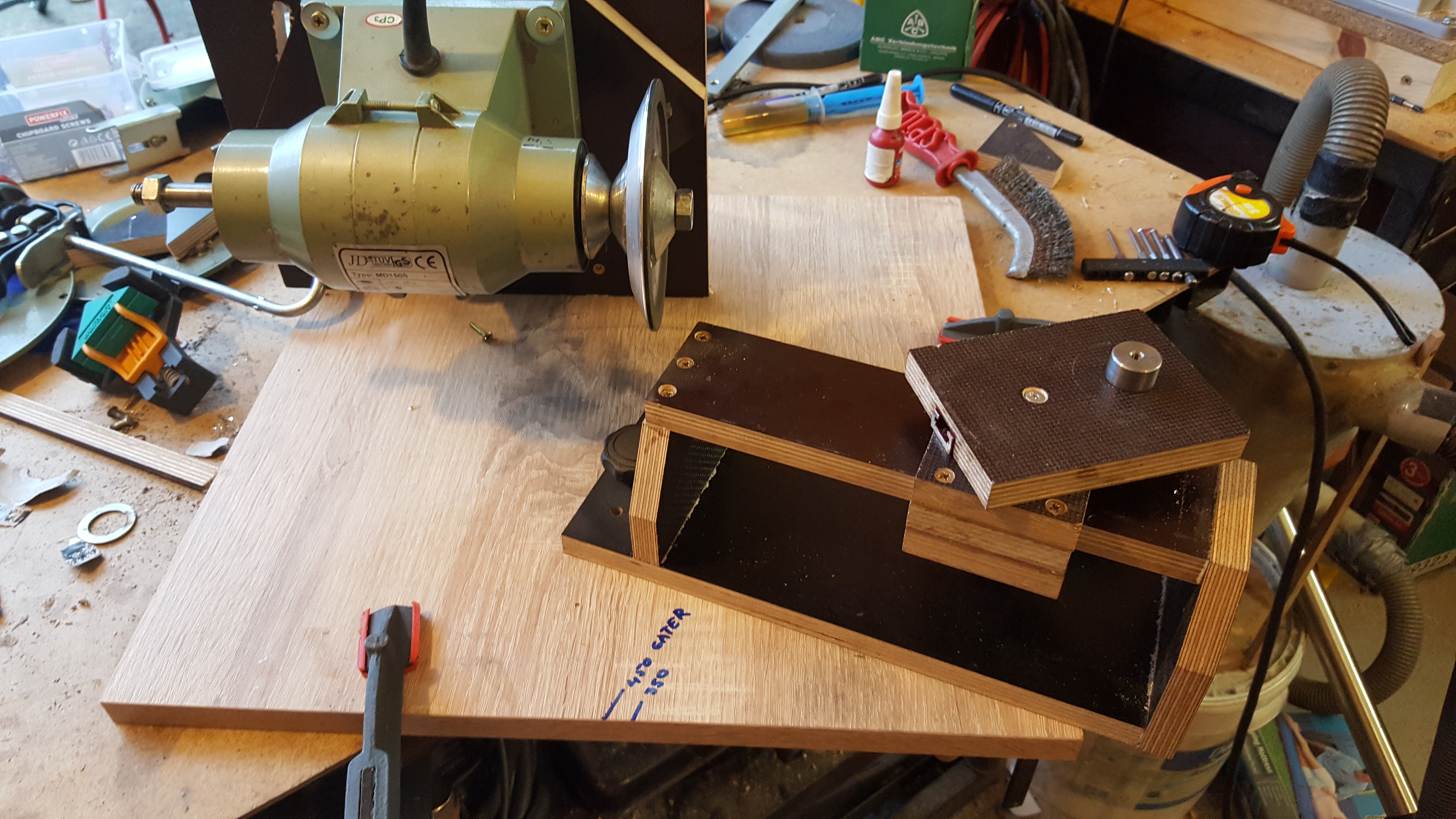 Využijem ho aj na ostatné kotúče v dialni. Je to taká vylepšená (na moje potreby) kópia bežne predávanej brúsky. Motor je naklápací +- 20 stupňov. Brúsi to všetky možné uhly na predku a vrchu zubov, okrem tých zrazených hrán na lamino... a celkom fajne. Musím len vylepšiť dorazy-aby bol každý jeden zub nabrúsený úplne rovnako.