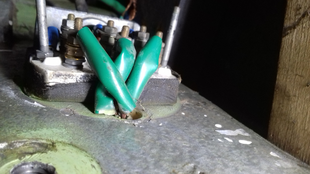 Nedávno jsem koupil vrtačku Jihokov V16 v nic moc stavu - ulámané skoro všechny páčky, samozřejmě prasklá pružina apod., ale jinak spokojenost, litina v pořádku, a o víkendu jsem se konečně dostal k nějakému čištění a renovaci. A když už jsem to měl rozložené na hlavní části, tak jsem se (bohudík) rozhodl to rozhodit úplně do posledního šroubku a udělat to od podlahy a evidentně jsem dobře udělal - kabel s 400V od boční krabičky k vypínači původní vlastník natáhl tak, že izolace kabelu končila ještě před dírou v litinovém těle a tím průchodem už prostrčil jenom 3 jednotlivé dráty, na které zoufale nasadil zelené návleky, . No a časem bužírka na drátech zpuchřela a oloupala se a jak to dopadlo je vidět na obrázku, jsem fakt rád, že jsem to objevil včas a nic se nestalo.