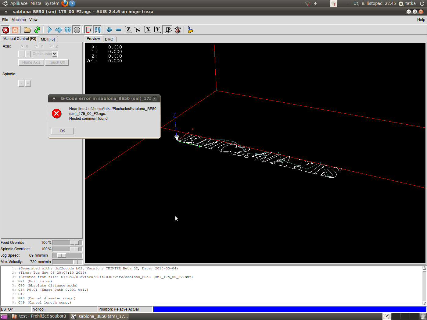 pokud jsem se netrefil s umístěním tak se omlouvám, potřebuji jako začátečník poradit. Mám vygenerovanou dráhu frezy pro tvorbu šablony křídla modelu letadla. Zatím mi to tak vždy bez problémů fungovalo, nyní potřebuji jiný profil a postup tvorby mám stejný jako jindy. Z drah pomocí dxf2gcode generuji kod pro EMC a to proběhne bez problémů. Pokud výstupní soubor otevřu v EMC tak to končí hláškou dle obrázku a nezobrazí se náhled v EMC. Laickým porovnáním s jiným souborem chybu nevidím. Může někdo pomoci? Přiložil bych i zdrojové ngc soubory, ale nějak mi to nejde