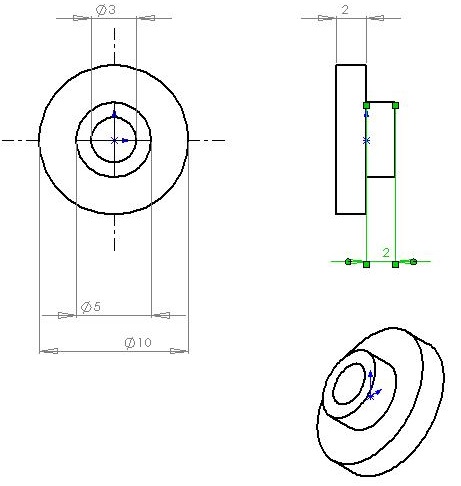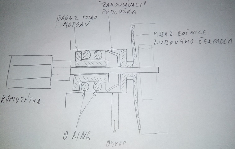 Takhle to bylo původně: Tak jsem myslel udělat váleček fí 10, na něm dva zápichy pro kroužky co ho budou těsnit v tělese čerpadla. V něm díra skrz 3 mm jako futro hřídele a do něj kroužek 3/1,5. Jenže jsou dvě otázky, zda ten váleček nebude tlakem v čerpadle tlačen do motoru a co s tím odkapem?