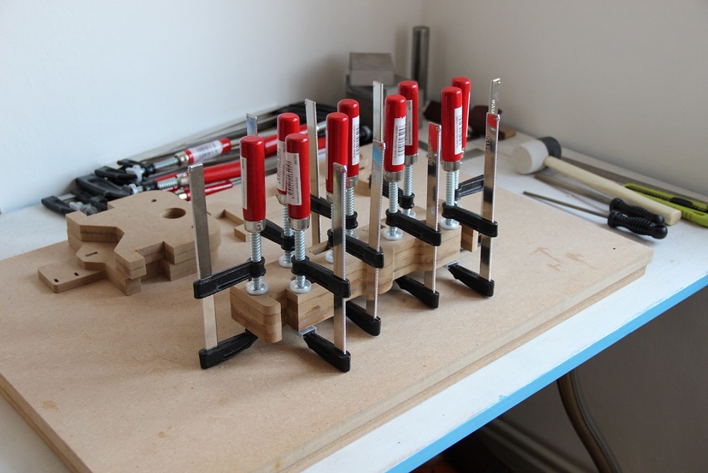 Takže je fixovaný jak ten frézovaný díl (přes tu pomocnou upínku), tak ten zbytek desky (přes nějaké upínky na okrajích).