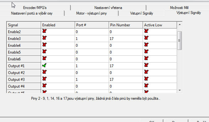 - v tabulce přiřazení signálů odklikni na řádku Spindle políčko Step Low Active (výstup máš zapojený proti zemi, takže je aktivní v High)